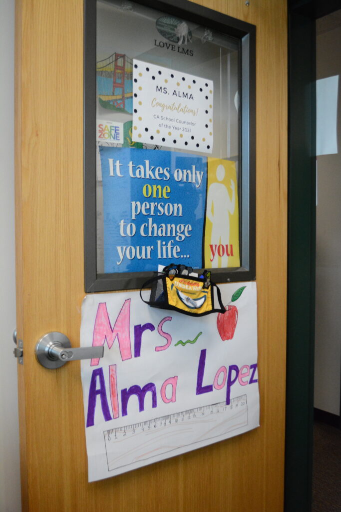 Alma Lopez’s office door at Livingston Middle School. Credit: Geneva Sum