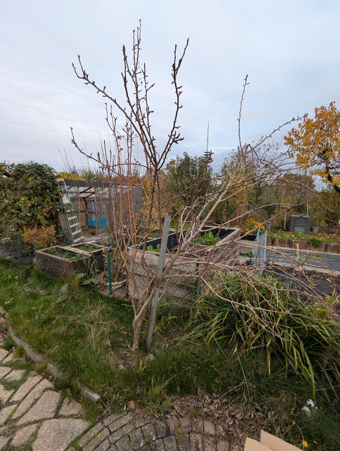 Ich würde keinen Baum Ende Herbst schneiden. Schlechte Wundheilung und im Früher kommen mehr Triebe. Schneid ihn nächstes Jahr nach der Ernte