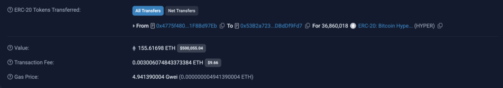 Meanwhile, the new BTC layer-2 coin, Bitcoin Hyper (HYPER), is stealing the headlines even before its launch. Despite the market crash, a whale swapped 155 ETH for HYPER, investing $500k into the new crypto.