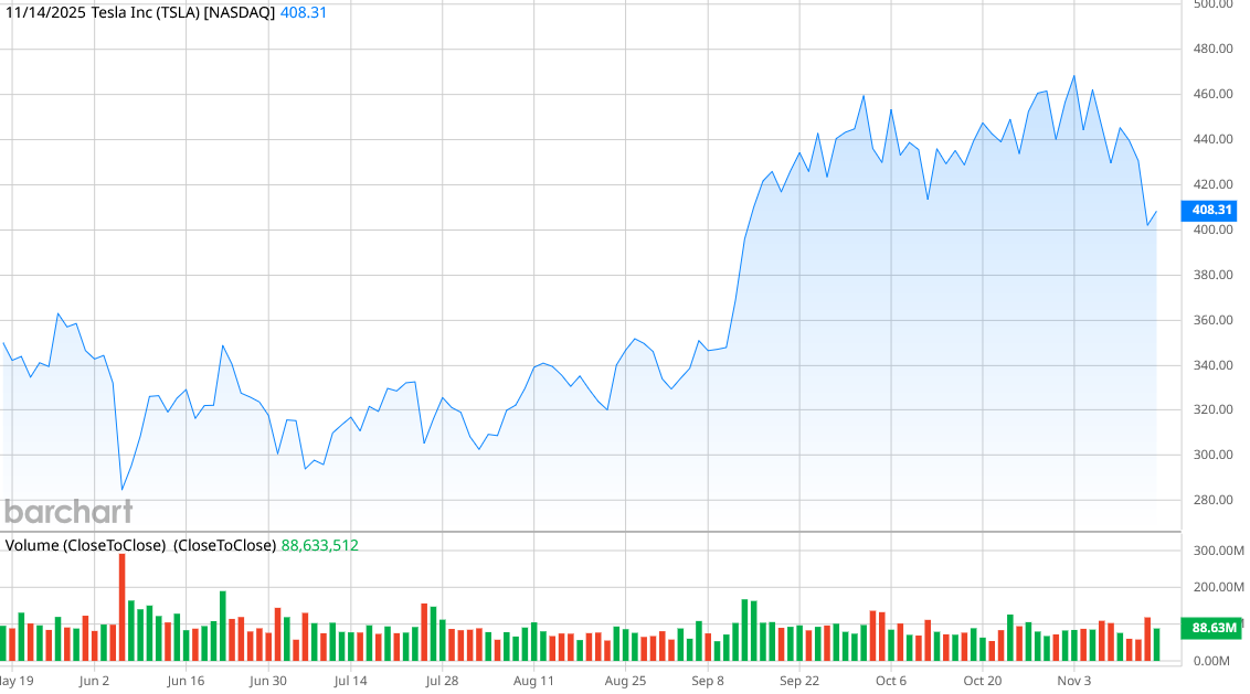 But these are fascinating times for the automaker—its electric vehicle sales are collapsing more than 20% from a year ago, and there are concerns about the company’s fourth-quarter deliveries—particularly in overseas markets. You would think that this would put TSLA stock in serious trouble, but the opposite is true. The stock topped $440 this month and, despite a recent drop, is still only 17% off its all-time high. Shareholders, meanwhile, rewarded Musk with a massive compensation package that could be valued as much as $1 trillion as the company leans hard into artificial intelligence.