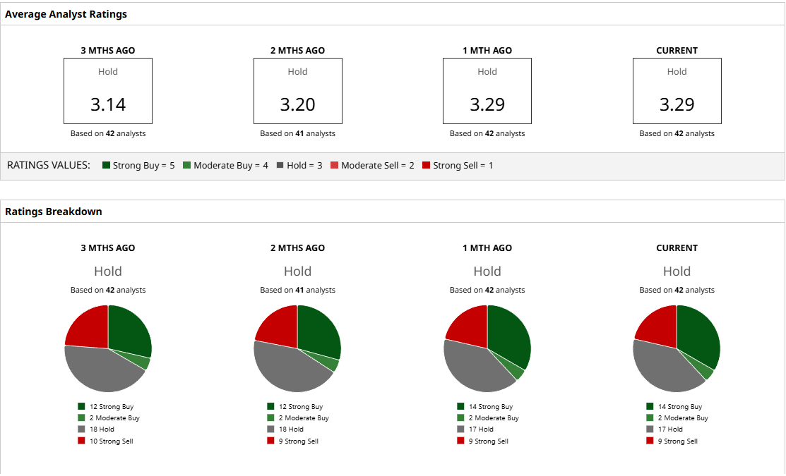 Musk has always been a polarizing figure, and Tesla has some of that weight as well. Forty-two analysts currently cover the stock, with 17 suggesting investors “Hold.” Sixteen analysts have “Buy” ratings, and nine have “Sell” ratings.