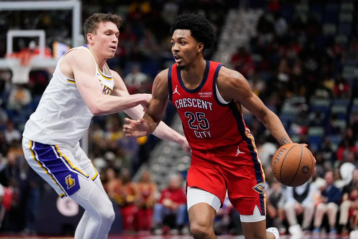 Pelikani so edinkrat na celotni tekmi povedli v 5. minuti, ko je Jeremiah Fears z zabijanjem poskrbel za minimalno prednost (11:10). V naslednjih štirih minutah so Jezerniki odgovorili z delnim izidom 15:0. Tudi minuta odmora, ki jo je vzel jezni strateg Willie Green ni pomagala. Dončić v prvi četrtini ni zadel iz igre, vseh šest točk je dosegel s prostimi meti, Lakersi pa so si nabrali 10 točk naskoka po 12 minutah (25:35).