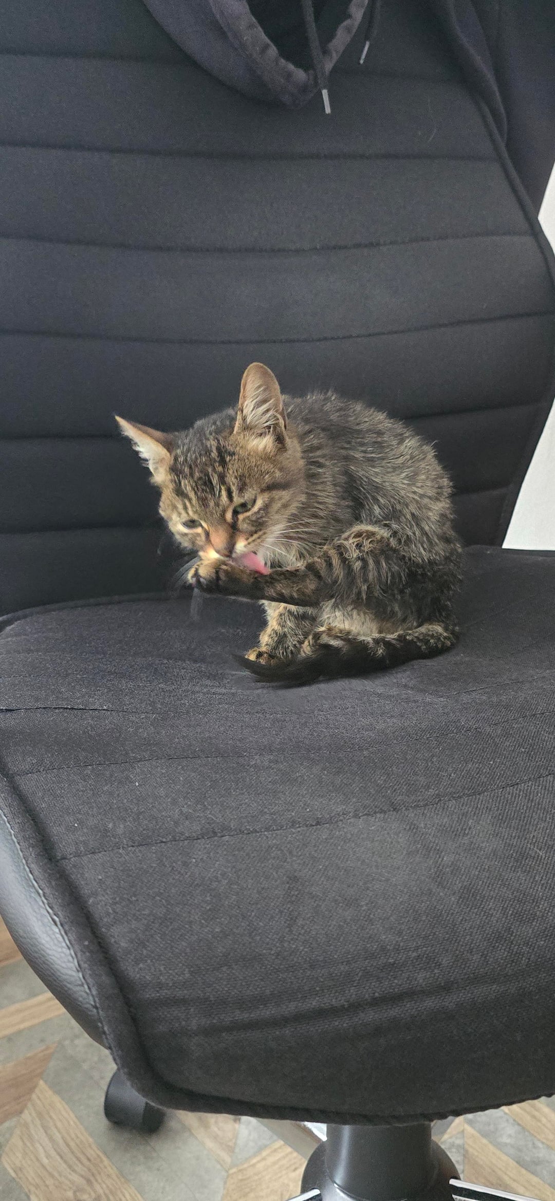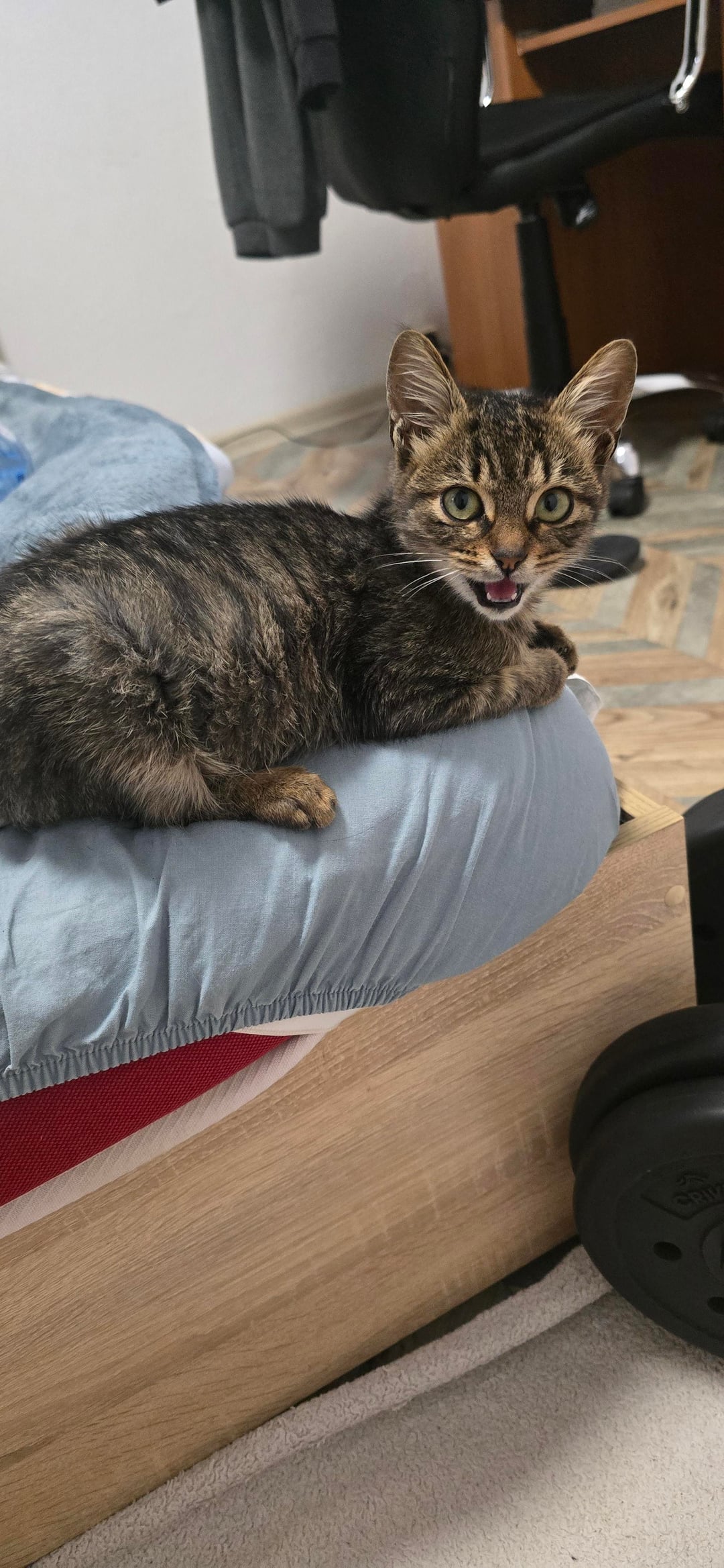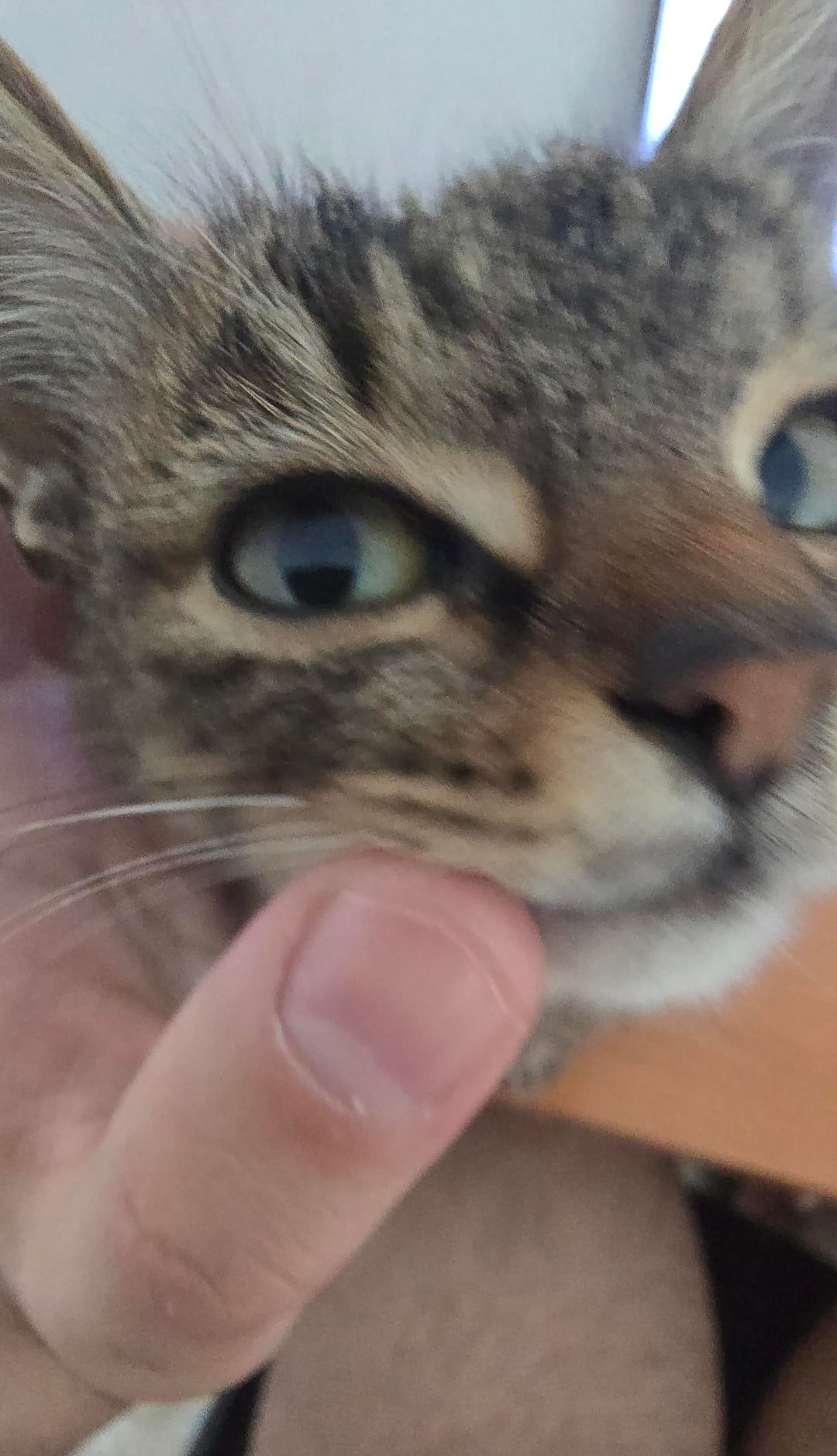 Това е котката ми, "Киви". Прибрах я от улицата преди месец и половина, горе-долу. Не е преглеждана от ветеринар, но е обезпаразитена от вътрешни и външни паразити чрез хапчета и капки. Къпана/Чиста е, видно здрава. Малка е, на около 4/5 месеца. Много е игрива и обичлива. Яде доста и е много енергична, и не обича да я вдигат.
