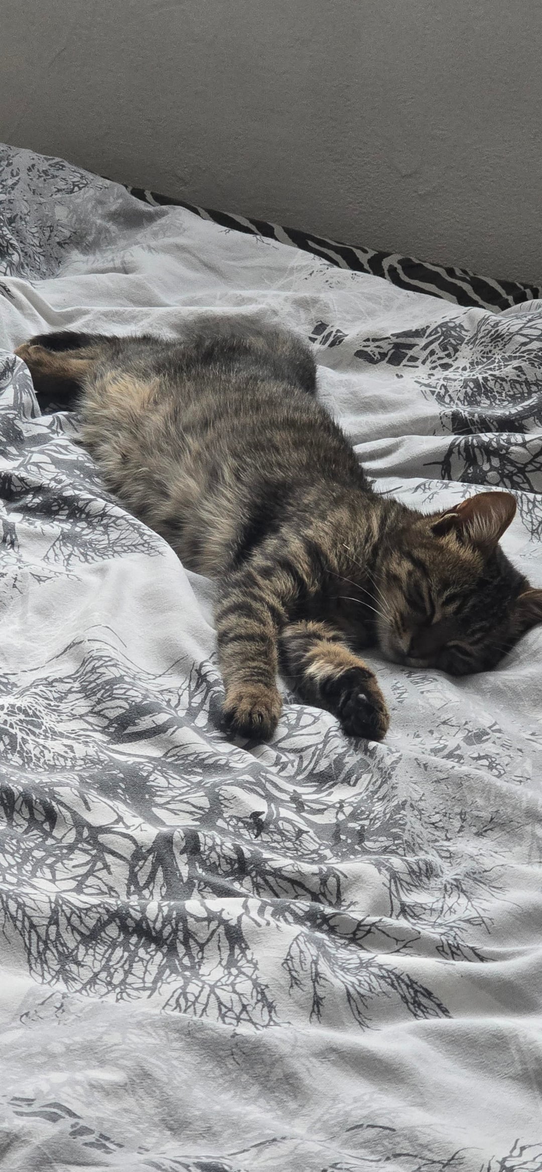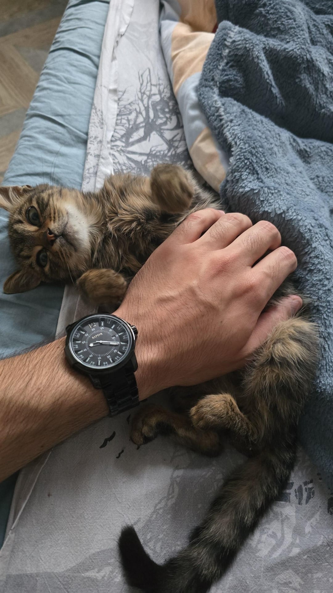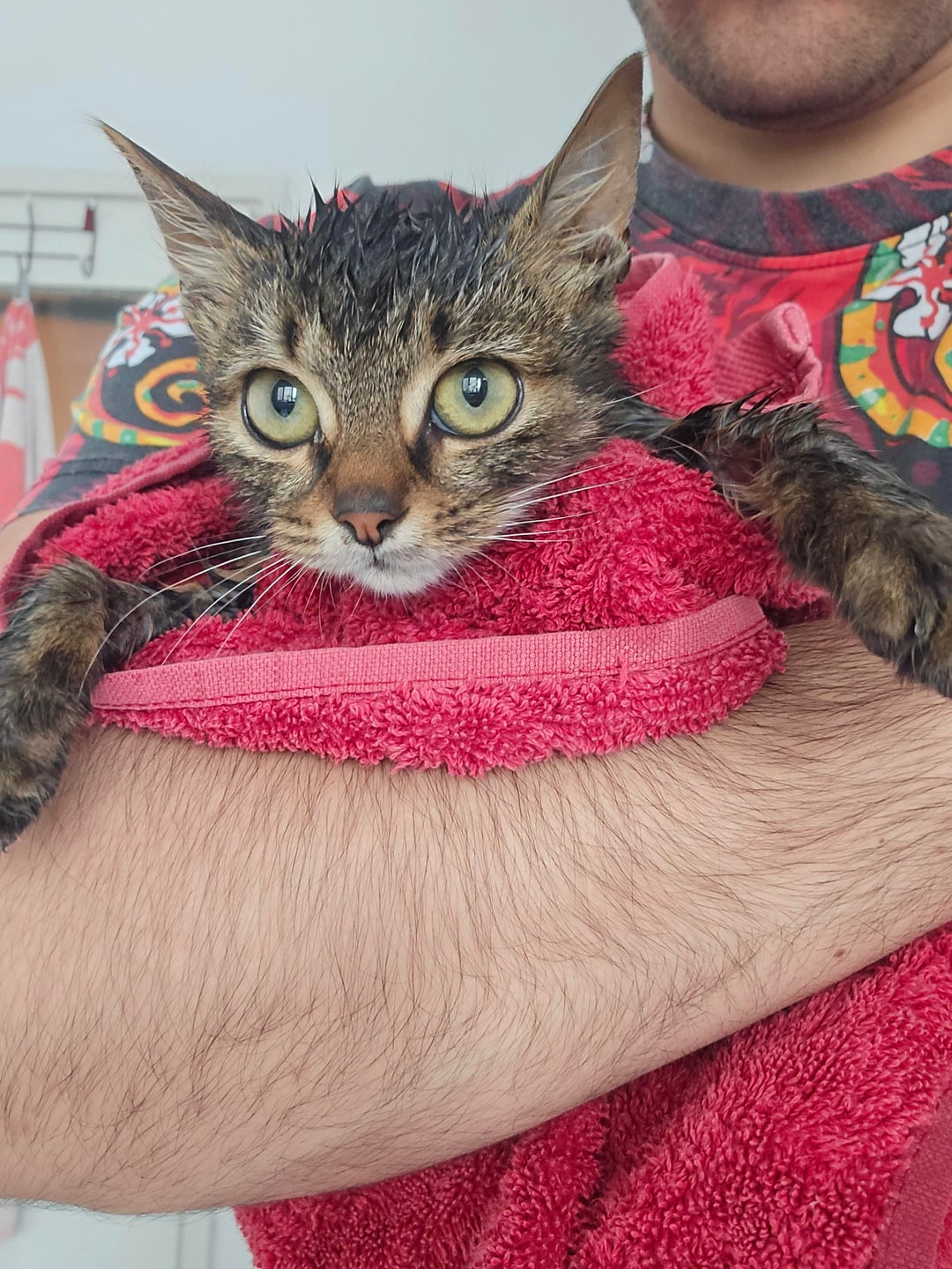Това е котката ми, "Киви". Прибрах я от улицата преди месец и половина, горе-долу. Не е преглеждана от ветеринар, но е обезпаразитена от вътрешни и външни паразити чрез хапчета и капки. Къпана/Чиста е, видно здрава. Малка е, на около 4/5 месеца. Много е игрива и обичлива. Яде доста и е много енергична, и не обича да я вдигат.