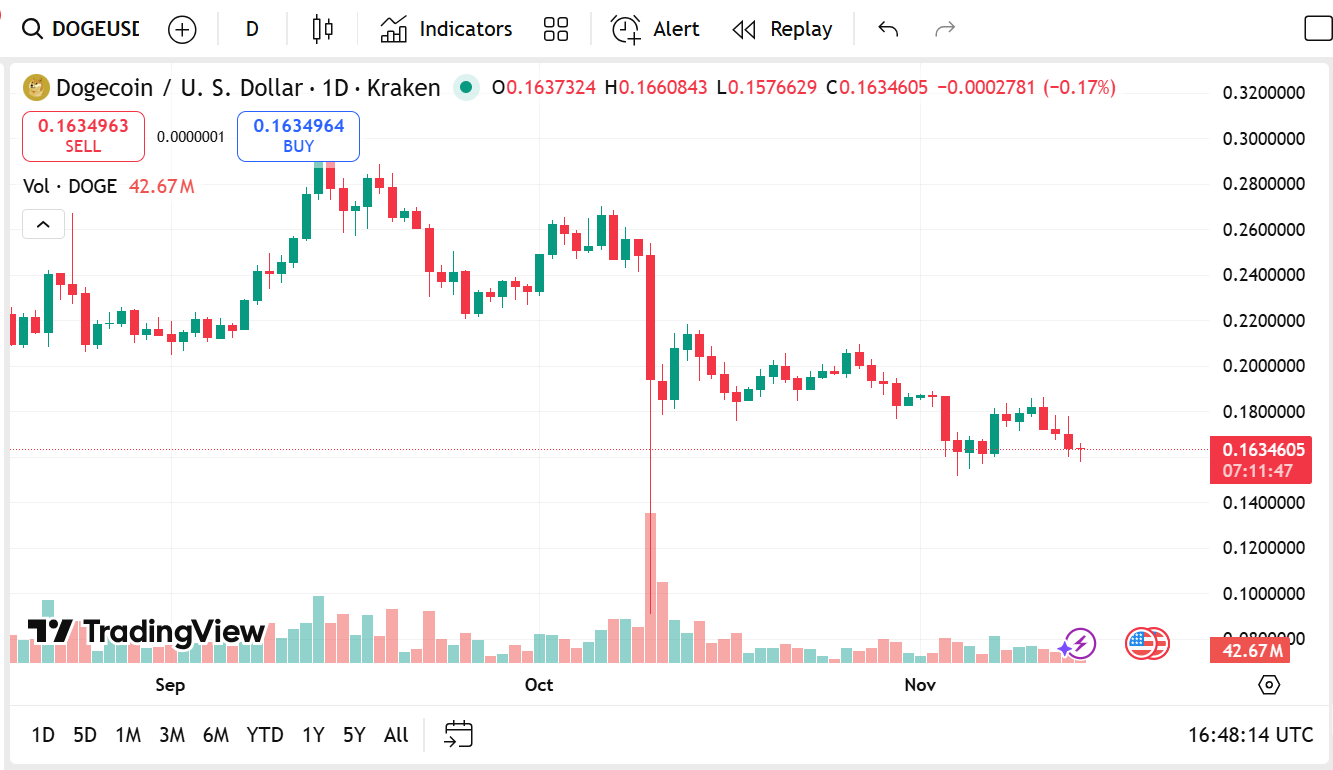 Dogecoin is currently selling at $0.1635 following a significant drop of about 4.41% with a market capitalization of about $24.93 billion.