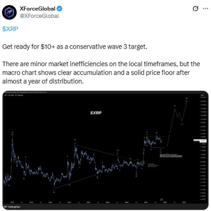 XForceGlobal, a top analyst on X (formerly Twitter), has pegged $10 as a conservative target for the XRP coin this cycle. They highlighted growing and clear accumulation, expected to push it above the current all-time high of $3.84 registered in 2018.
