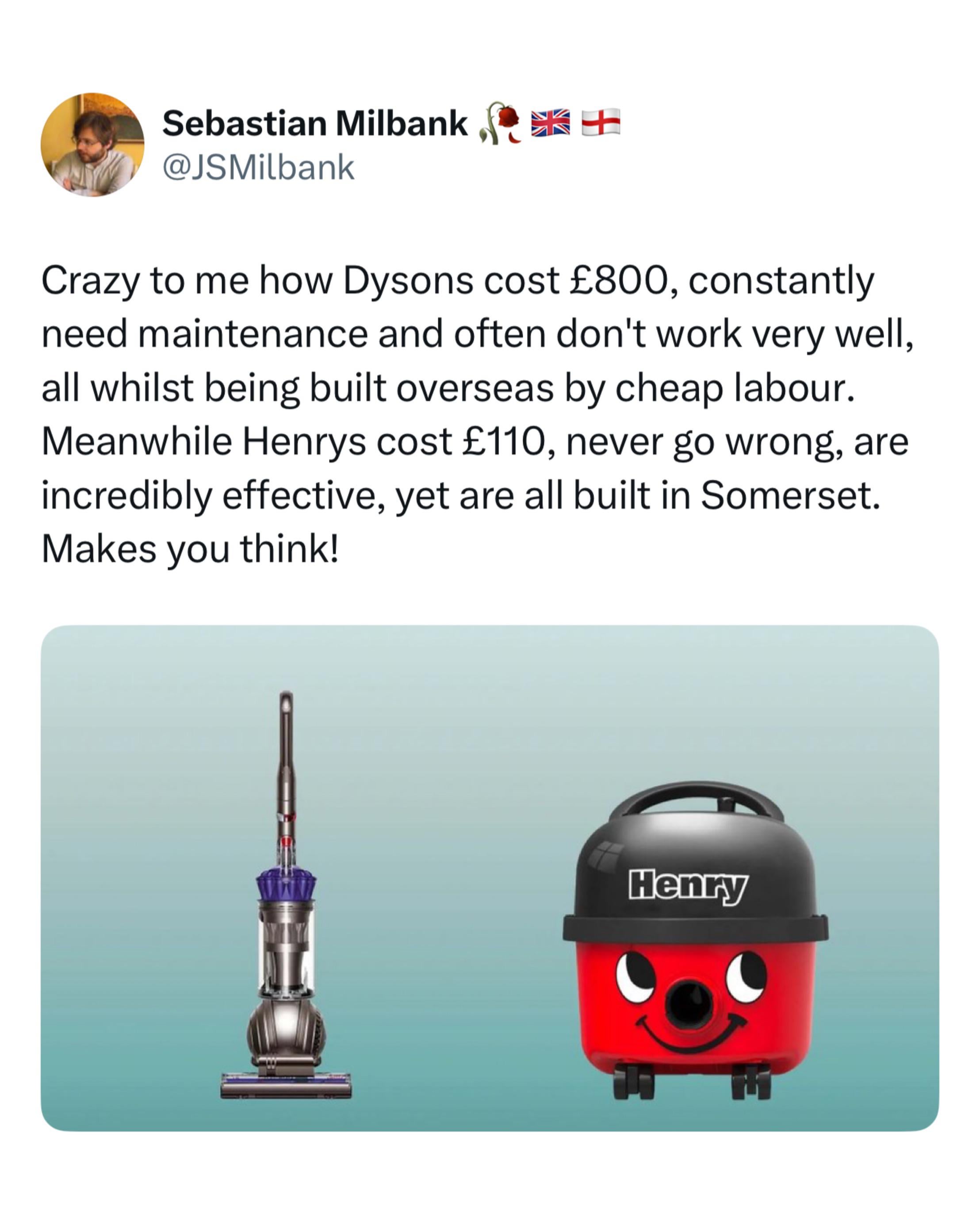 I have a Henry hoover that I bought maybe 15 years ago, it cost £100 then and they cost £110 now you say? I have abused it, it is my “for shit jobs” like hoovering out the ash from fire kinda jobby and I’ll be damned if the thing doesn’t just keep going. Also, fuck James Dyson he is a prick.