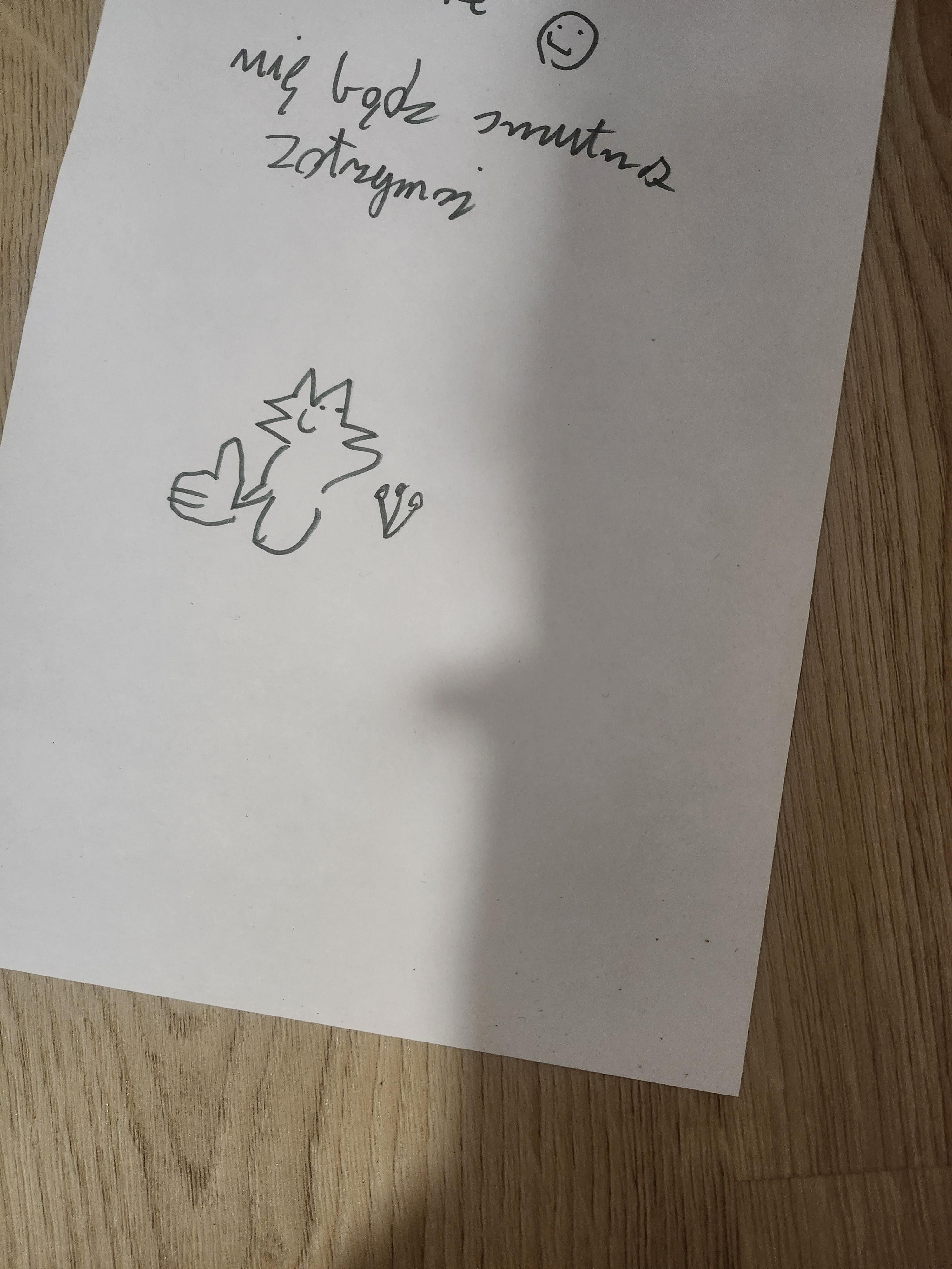 Dzisiaj wieczorem dostałam oto taki wyrafinowany list od mojej młodszej siostry. Kontekst jest taki, że smutasowałam się jakimiś pierdołami na tyle mocno, że moja młodsza siostra weszła mi do pokoju i wręczyła mi ten oto cud literacki. Jeżeli kogoś dzisiaj oczy bolą, to dla klaryfikacji: ten rysunek na dole to koteł.