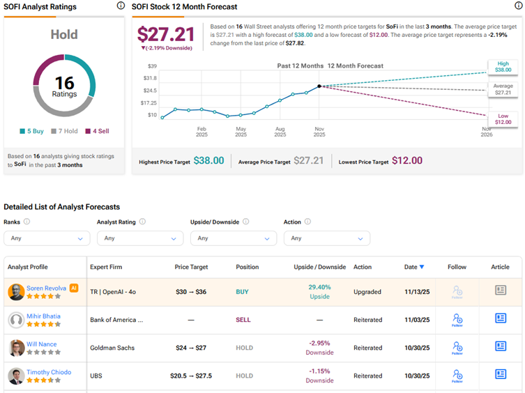 Currently, Wall Street has a Hold consensus rating on SoFi Technologies stock based on five Buys, seven Holds, and four Sell recommendations. The average SOFI stock price target of $27.21 indicates 2.2% downside risk.