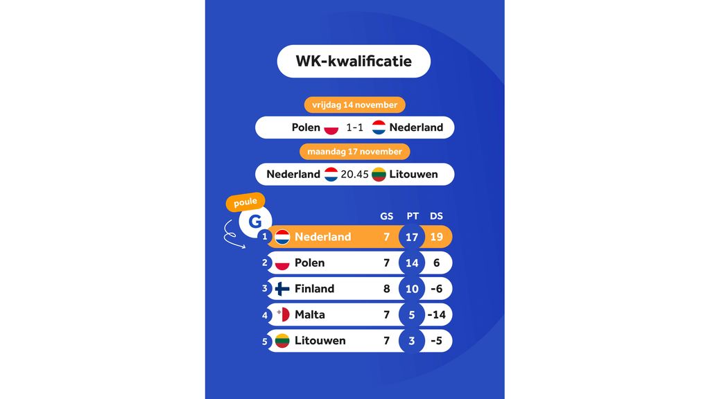 Het Nederlands elftal is officieel nog niet geplaatst voor het WK en speelt maandagavond nog een thuisduel tegen Litouwen. Dat lijkt op het eerste oog een formaliteit, want Nederland staat drie punten voor op achtervolger Polen en heeft een doelsaldo dat veel beter is (+19 om +6).
