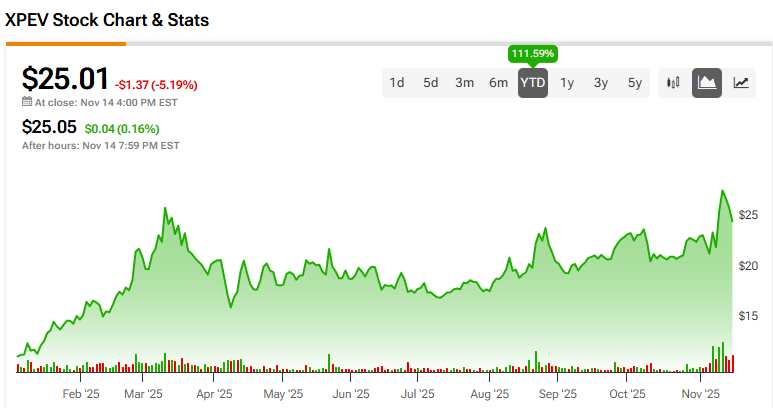 Xpeng Inc. ADR (XPEV), the Chinese manufacturer of smart EVs, heads into its next earnings report with clear growth signs and a sharp rise in its stock price. The share price is up more than 110% this year, and that move now sets a tighter bar for what Wall Street hopes to see on revenue, margin, and EPS.