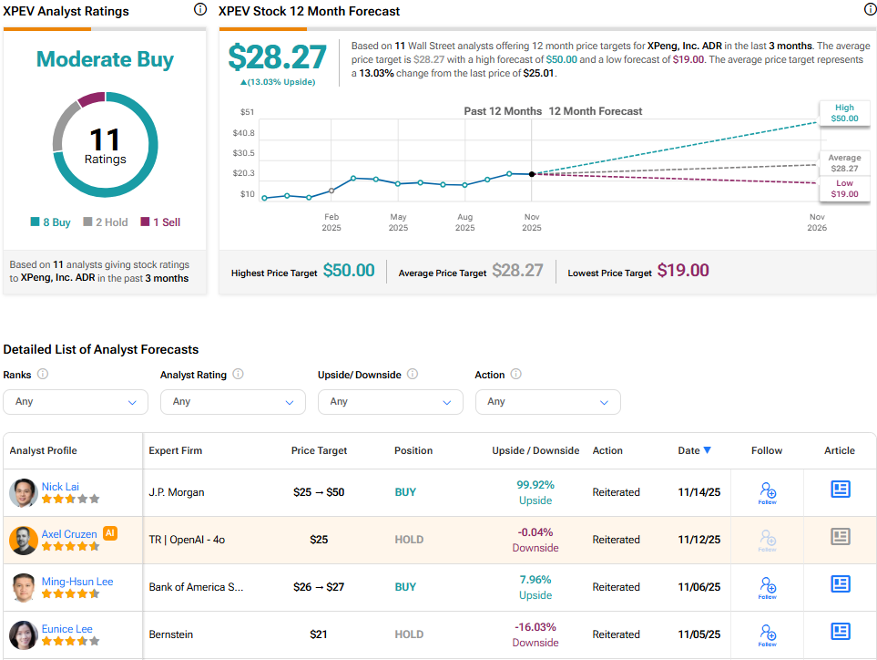 Ahead of earnings, Xpeng Inc. boasts a Moderate Buy consensus rating. The average XPEV stock price target is $28.27, implying a 13.03% upside from the current price.