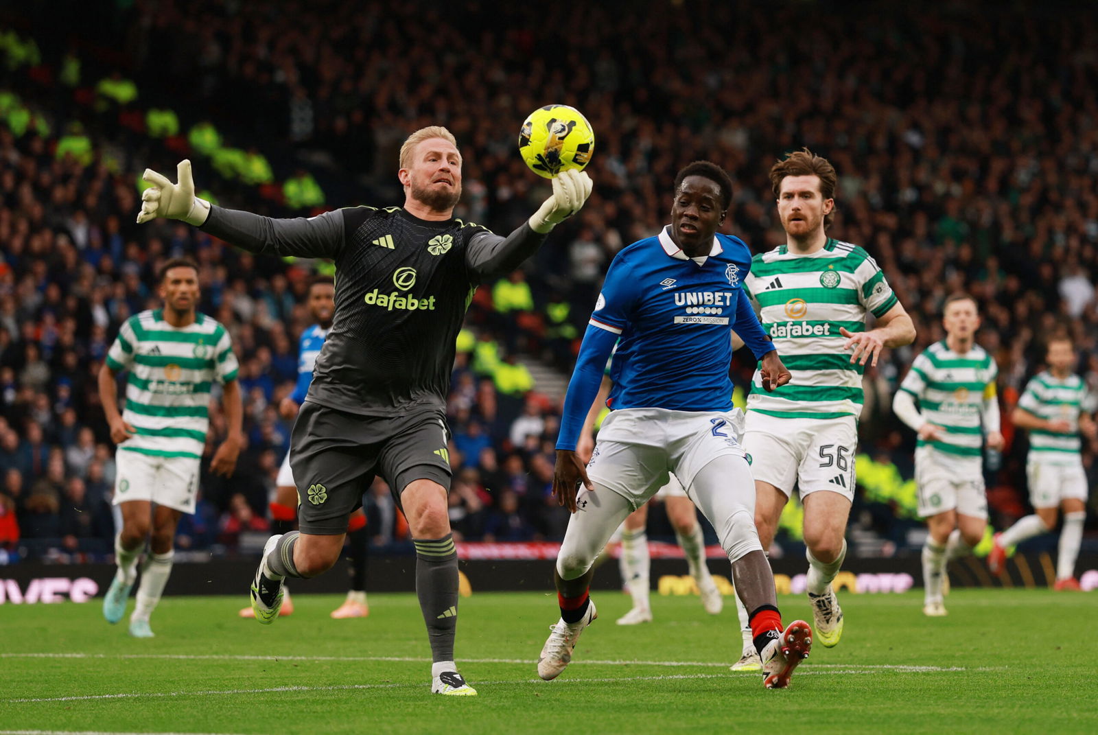 Soccer Football – Scottish League Cup – Semi Final – Celtic v Rangers – Hampden Park, Glasgow, Scotland, Britain – November 2, 2025 Celtic’s Kasper Schmeichel in action with Rangers’ Djeidi Gassama Action Images via Reuters/Lee Smith
