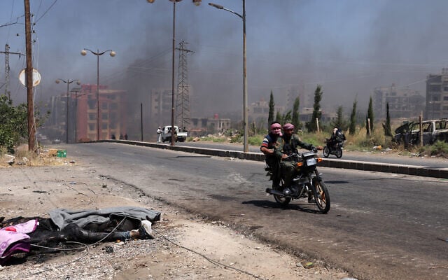Bodies lie on the ground as Bedouin and tribal fighters drive along a street amid a cloud of smoke in the northern part of the city of Sweida in southern Syria’s Druze majority province on July 19, 2025. (Bakr ALkasem / AFP)