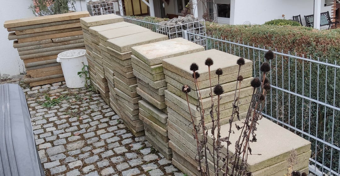 Außer den Steinen auf Bild 1 und 4 haben wir auch noch das Material auf Bild 2 (war ein "Geschenk", wir hatten erst überlegt die Wege selbst zu pflastern). Das sind 100 Platten 40×40 und dünne Randsteine.