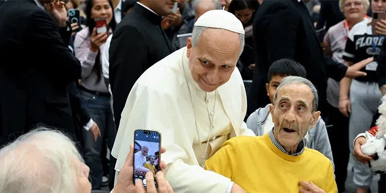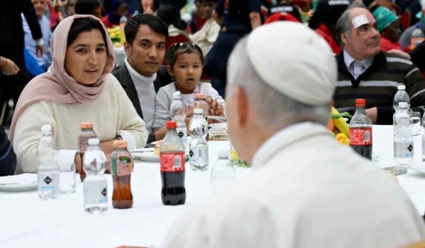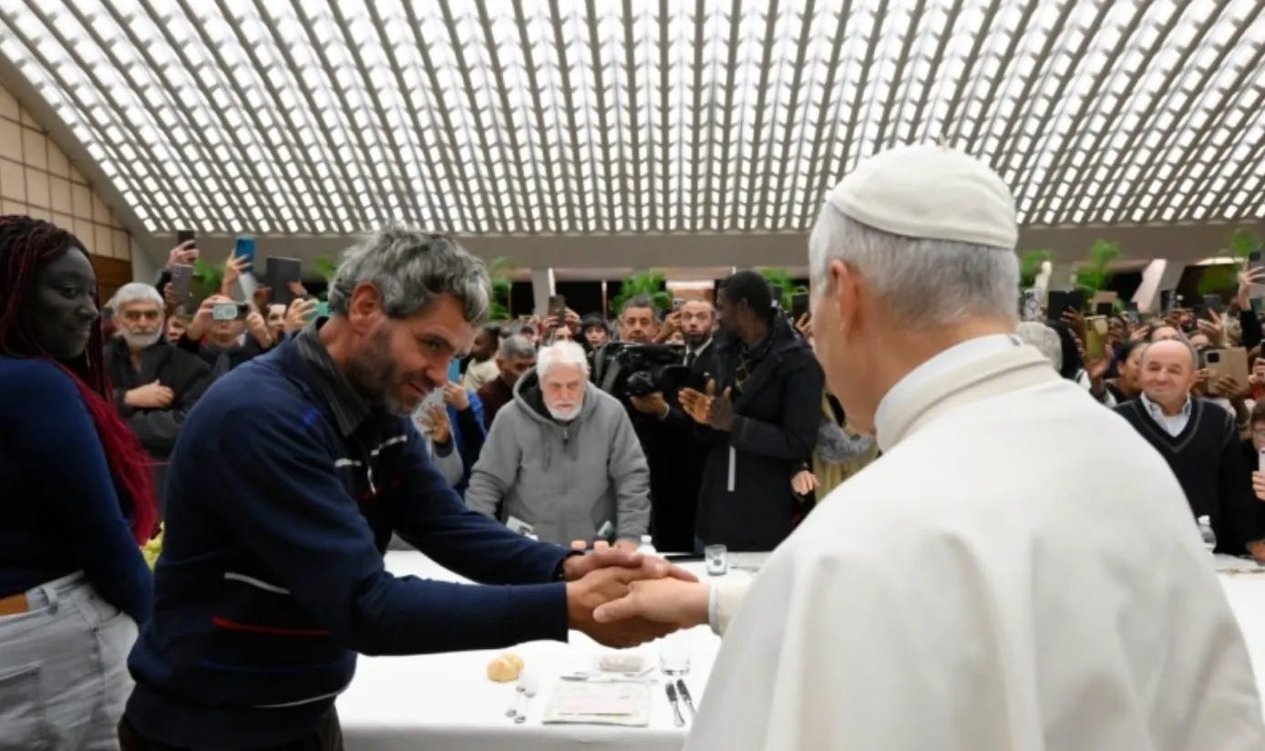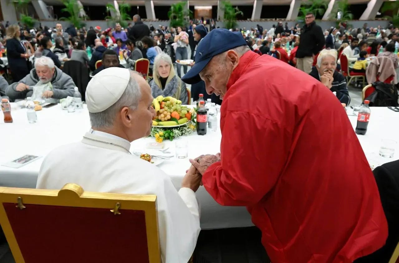 And, of course, Pope Leo praised his predecessor, saying: “With great joy, we gather this afternoon for this meal on this day that was so dearly desired by my beloved predecessor, Pope Francis. Let’s have a big round of applause for him.”
