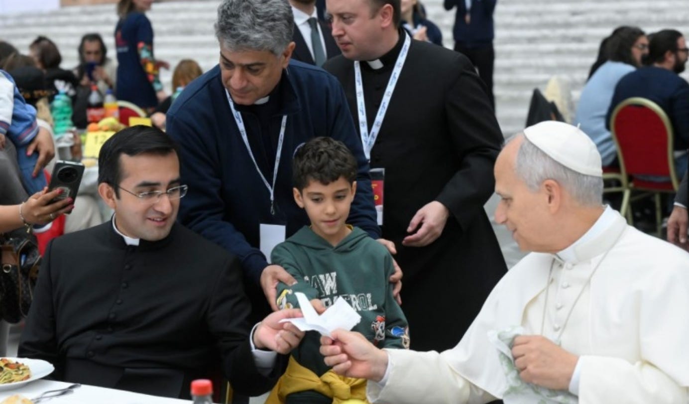 Before the meal — lasagna, breaded chicken cutlets with potatoes, fresh fruit from Naples and the traditional Italian dessert babà, a Neapolitan cake soaked in syrup — Pope Leo prayed: “May the Lord bless the gifts we are about to receive, bless the life of each one of us, our loved ones, and all those who have accompanied us on our journey. Let us invoke the Lord’s blessing upon those who suffer from violence, war and hunger, and may we celebrate this feast today in a spirit of fraternity.”