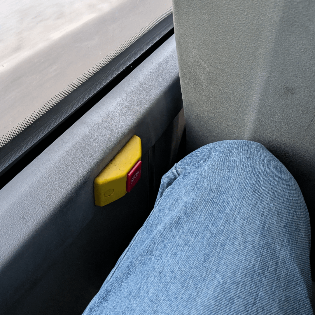 Varför måste det vara glasruta nästan ända ner till sätena på moderna bussar? Hade rutan slutat en bit upp så kunde man satt knappen över knähöjd men ändå lättåtkomlig för diverse varierade personer.