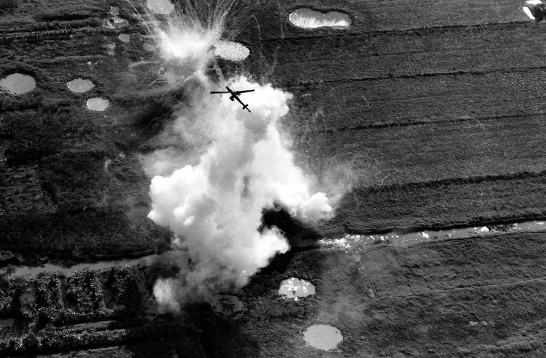 >Kissinger bombs Laos and Cambodia with 2,000,000 tons of ordnance.