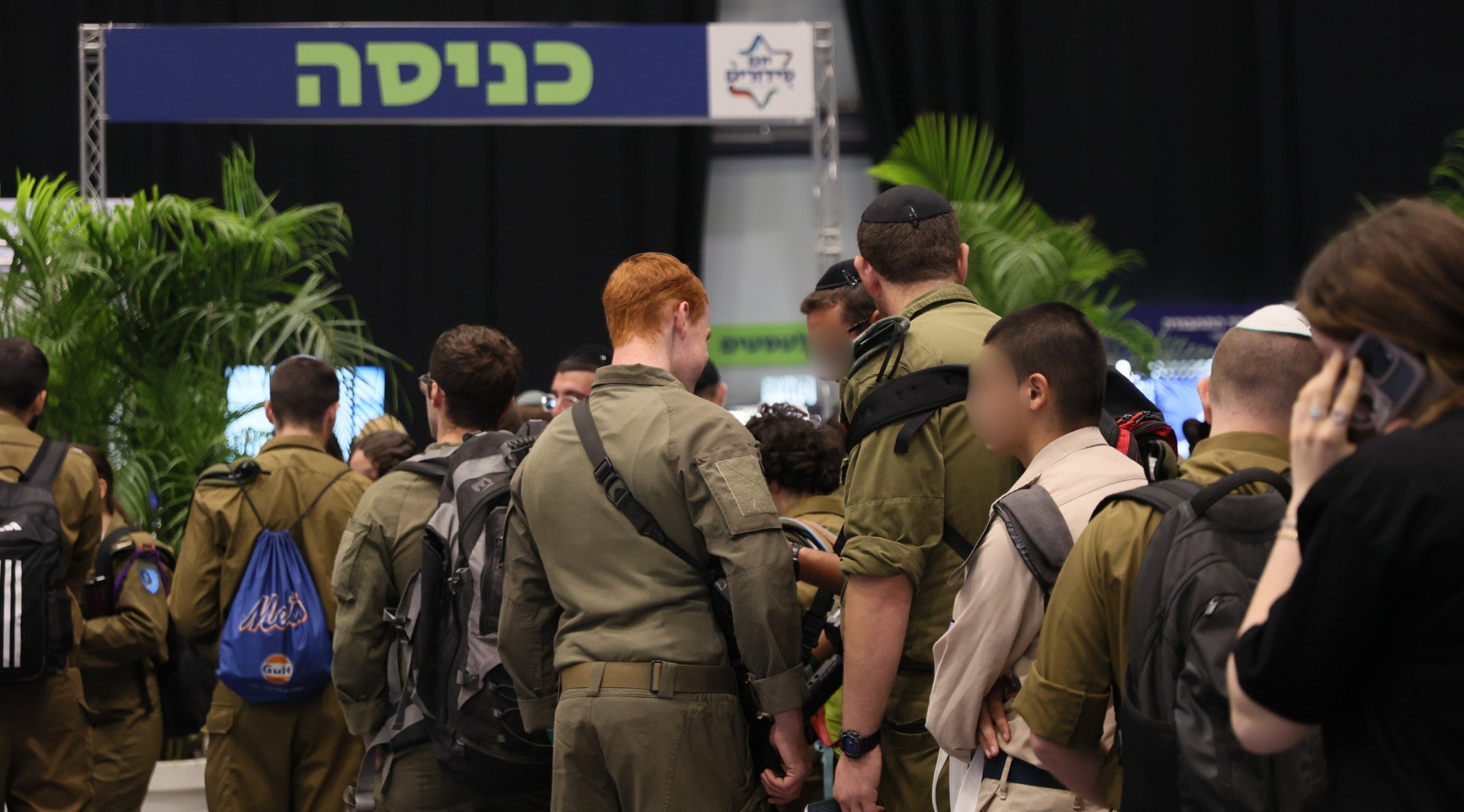Soldiers line up to meet with representatives of banks, government agencies, embassies, and others marshalled to Tel Aviv for a single Errands Day event designed to help Lone Soldiers speed through bureaucratic processes that normally take weeks or months, Nov. 13, 2025. (Sivan Shachor)