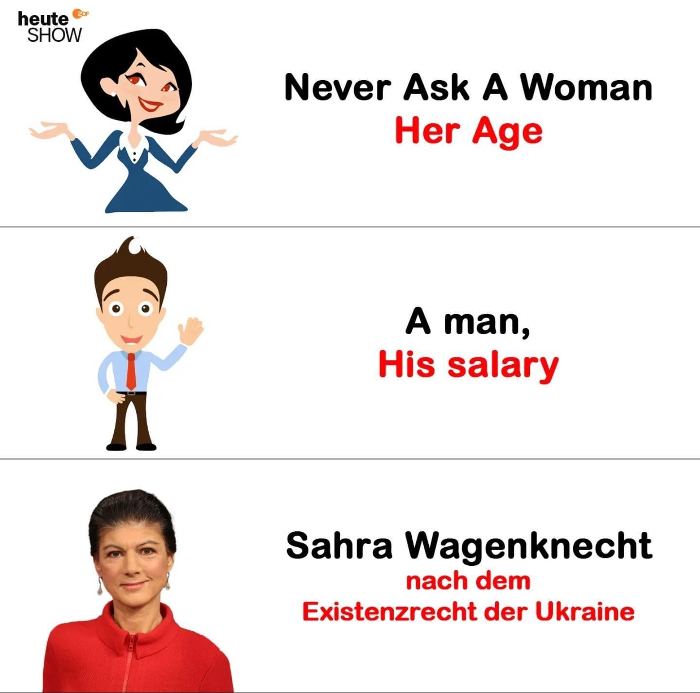Frag niemals eine Frau nach ihrem Alter, einen Mann nach seinem Gehalt, oder Wagenknecht, wie die Ukrainer ohne Waffen verhandeln sollen