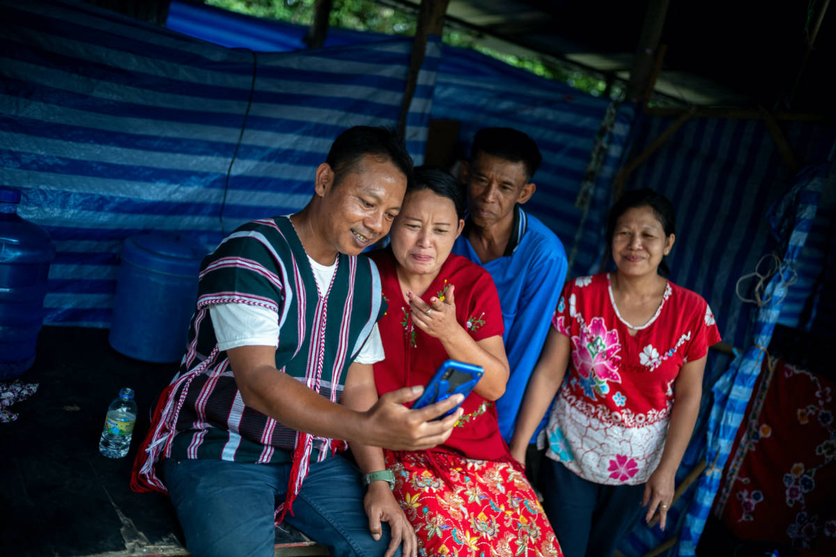 Tun Min Lat and his wife Lae Lae, Burmese refugees who were granted work permits by the Thai Government, call their daughter on a mobile phone, after an orientation before working at longan farms at their camp site in Chanthaburi province, Thailand, on 5th November, 2025. PICTURE: Reuters/Athit Perawongmetha