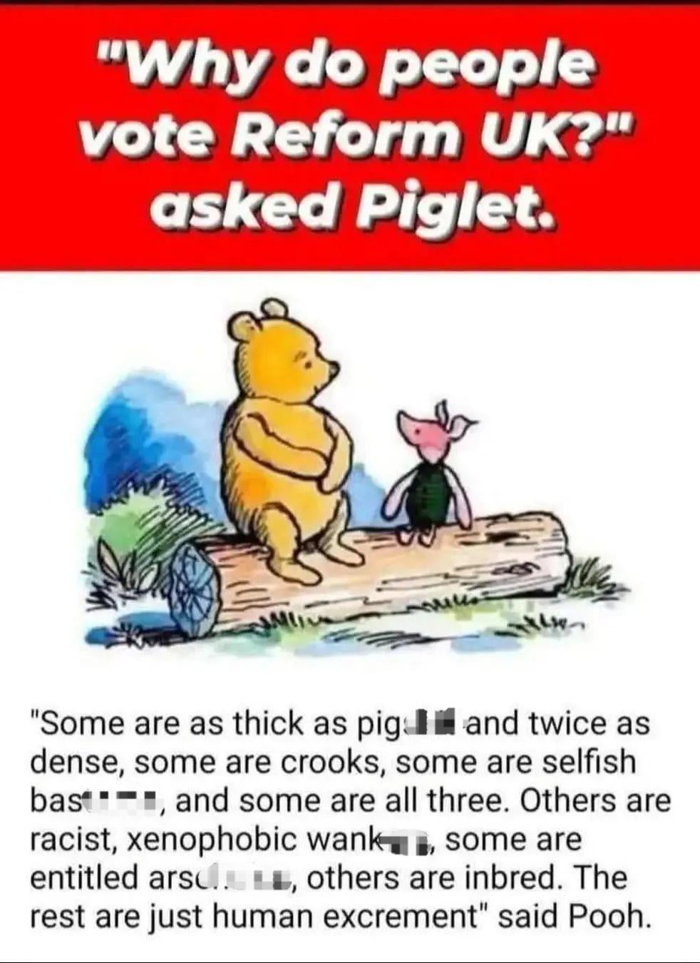 5. I’m not voting Reform, but using children’s characters to push stuff like this is just cringe. It feels like Facebook level drivel. Do you really need Winnie the Pooh to express your political opinion for you? Honestly, what even is this group anymore?