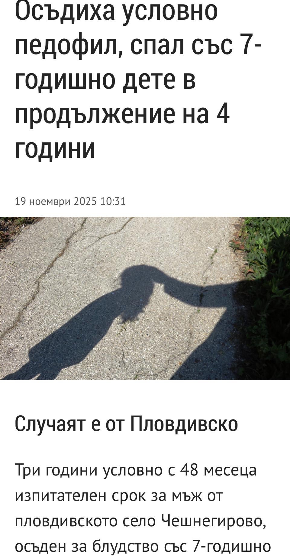 Скрийншотът дори не показва цялата гнусота на картинката, случвало се е многократно в рамките на 4 години: https://nova.bg/news/view/2025/11/19/518065/%D0%BE%D1%81%D1%8A%D0%B4%D0%B8%D1%85%D0%B0-%D1%83%D1%81%D0%BB%D0%BE%D0%B2%D0%BD%D0%BE-%D0%BF%D0%B5%D0%B4%D0%BE%D1%84%D0%B8%D0%BB-%D1%81%D0%BF%D0%B0%D0%BB-%D1%81%D1%8A%D1%81-7-%D0%B3%D0%BE%D0%B4%D0%B8%D1%88%D0%BD%D0%BE-%D0%B4%D0%B5%D1%82%D0%B5-%D0%B2-%D0%BF%D1%80%D0%BE%D0%B4%D1%8A%D0%BB%D0%B6%D0%B5%D0%BD%D0%B8%D0%B5-%D0%BD%D0%B0-4-%D0%B3%D0%BE%D0%B4%D0%B8%D0%BD%D0%B8/
