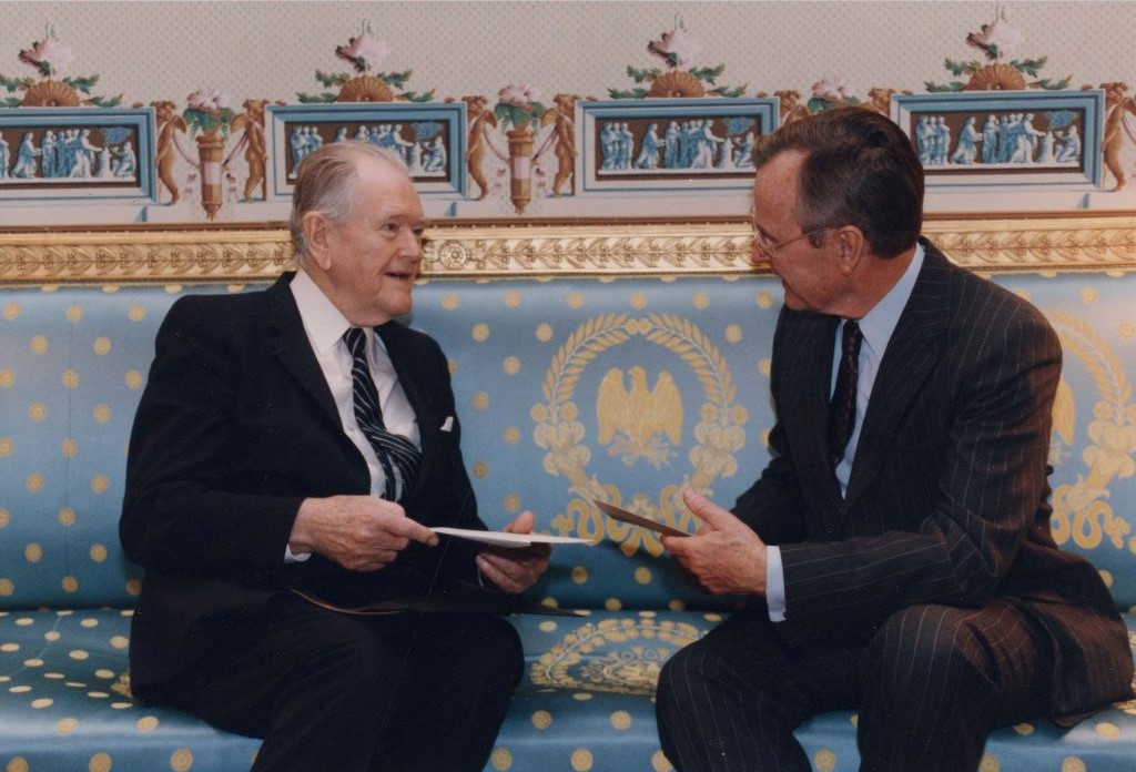 Ernst Jaakson, stationed at Estonia’s Consulate General in New York City, safeguarded Estonia’s legal continuity through 69 years of uninterrupted diplomatic service. After the country regained independence, he was appointed Estonia’s ambassador and permanent representative to the UN on 5 September 1991 (pictured here with US President George H. W. Bush). After passing the post to his successor, Toomas Hendrik Ilves, Jaakson continued his work at the Consulate General until his death on 4 September 1998. Photo by the Estonian foreign ministry.