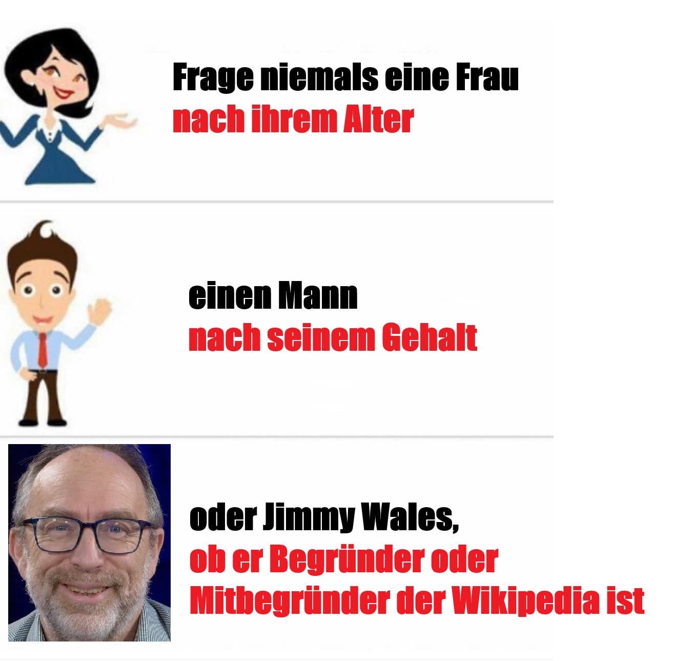 Geschichte dazu: Jimmy Wales war kürzlich bei jung&naiv zu Gast und stellte sich als “Begründer” der Wikipedia vor. Tilo hat nagefragt, ob er eigentlich Gründer oder Mitbegründer der Wikipedia sei. Wales sagte, es sei ihm egal, darum ginge es gar nicht. Nach einer Nachfrage verlor er die Fassung und verließ nach unter einer Minute die Sendung. Hintergrund ist ein Streit zwischen Wales und seinem ehemaligen Mitstreiter Larry Sanger darum, wer wie viel zur Wikipedia geleistet hat. War ein sehr lustiges Gespräch. Man kann gut reinschauen, der Großteil des Videos ist eh Abspann.