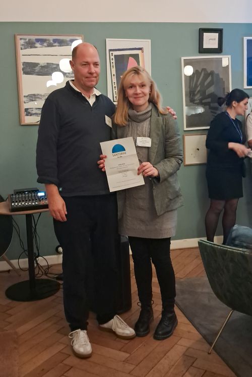 One of the two winners of the draw at the Danish workshop for a 3-day stay on Santorini, with the head of the GNTO Scandinavia Service, Eftychia-Christina Aivalioti.