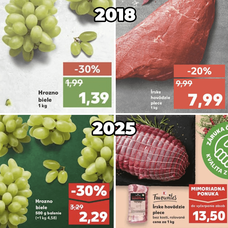 Zo zaujímavosti som si otvoril leták z Kauflandu z roku 2018 a terajší z 2025.