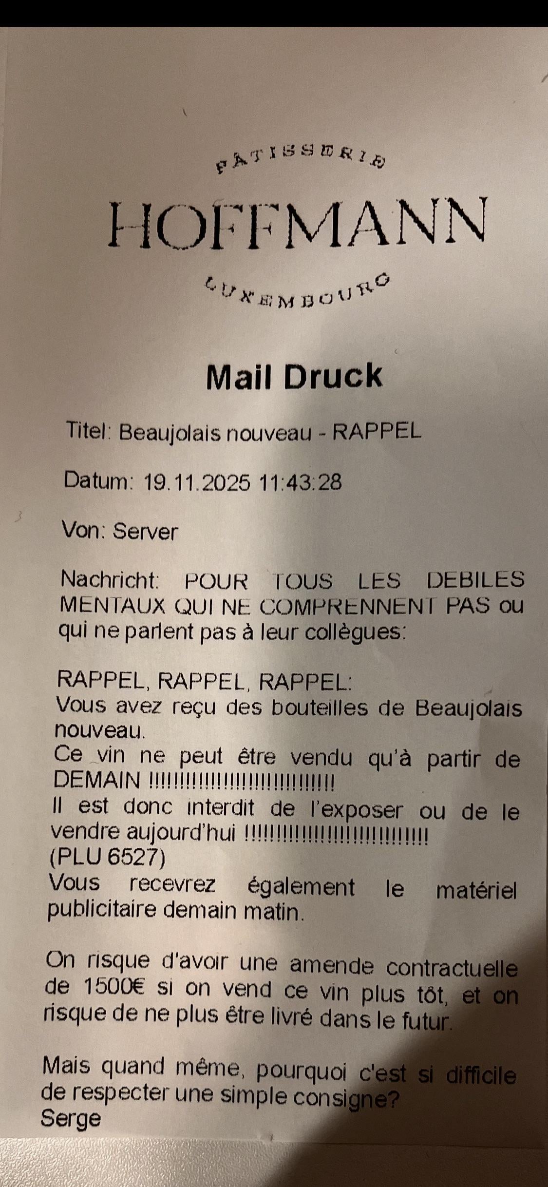 Quand tu reçois du siège de la boite oú tu travailles, ces genre de message #Patisserie #Hoffmann #Luxembourg #STI #Harcelement #Travail #Boycott #Gouvernement #ShameOnYou