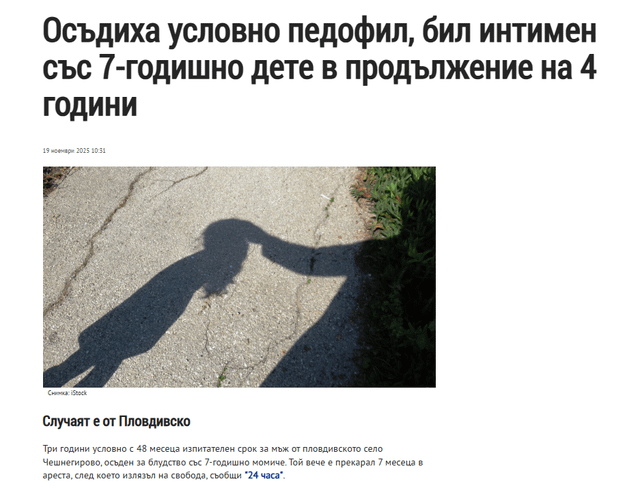 Проблемът е че нашите закони в това отношение са приравнени към немските, а там е най-лекото престъпление едва ли не и имената на осъдените се пазят като национално богатство. Даже имаше случай на ПРИЕМНО СЕМЕЙСТВО май от бургаско което продаваше децата на педофили. Аз самият съм срещал обява в ОЛХ само със снимка на малко момченце и надпис ” за срещи звънете на тел. ХХХХХ” и подадох сигнали и към ГДБОП и към безполезната полиция и нищо не се случи.
