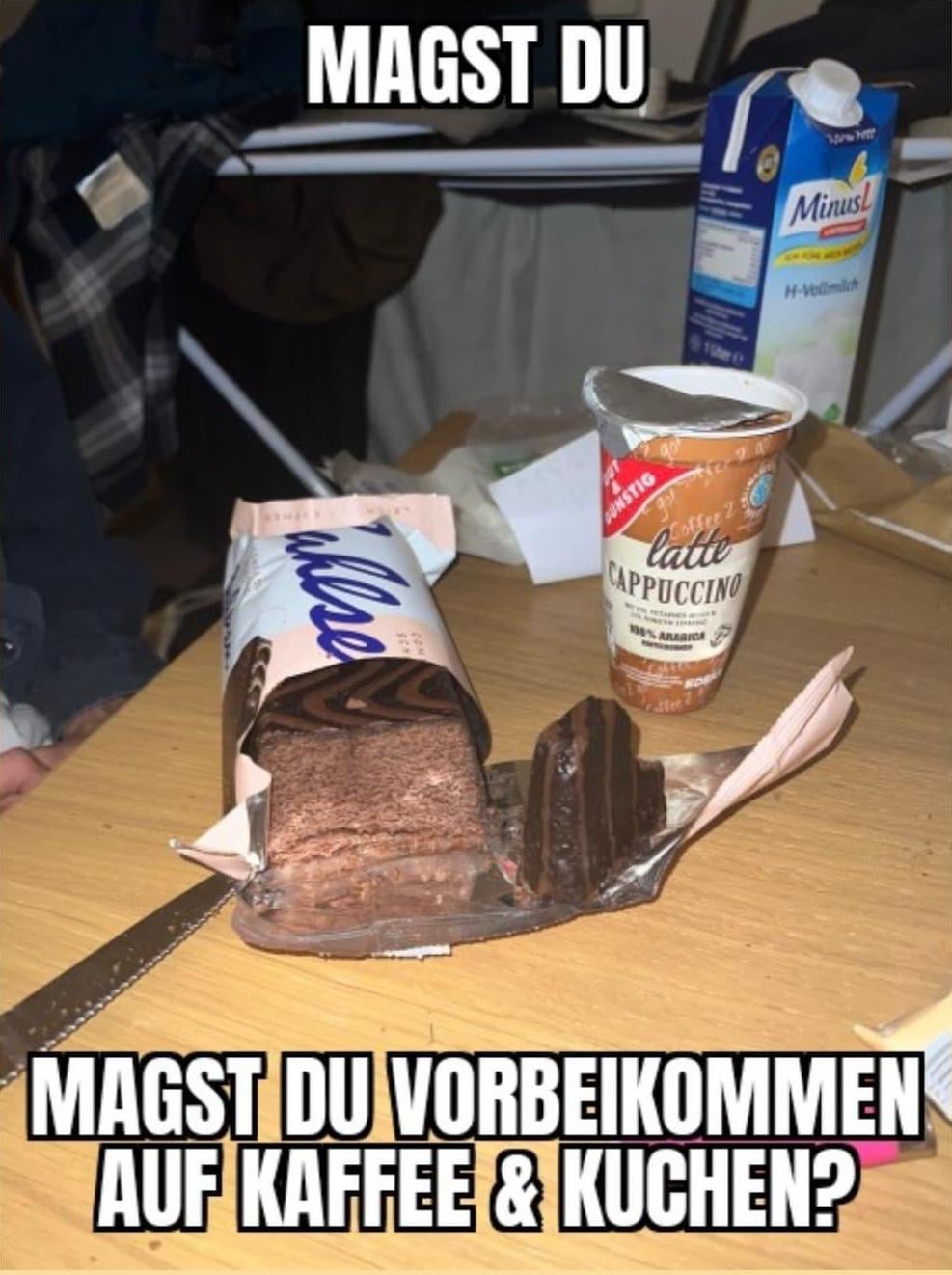 24. Ich hab ja nichts gegen den gekauften Kuchen, aber das mit dem kalten, turbo gesüßten Kaffee artigen Getränk zusammen ist halt einfach ne schäbigen Combo.