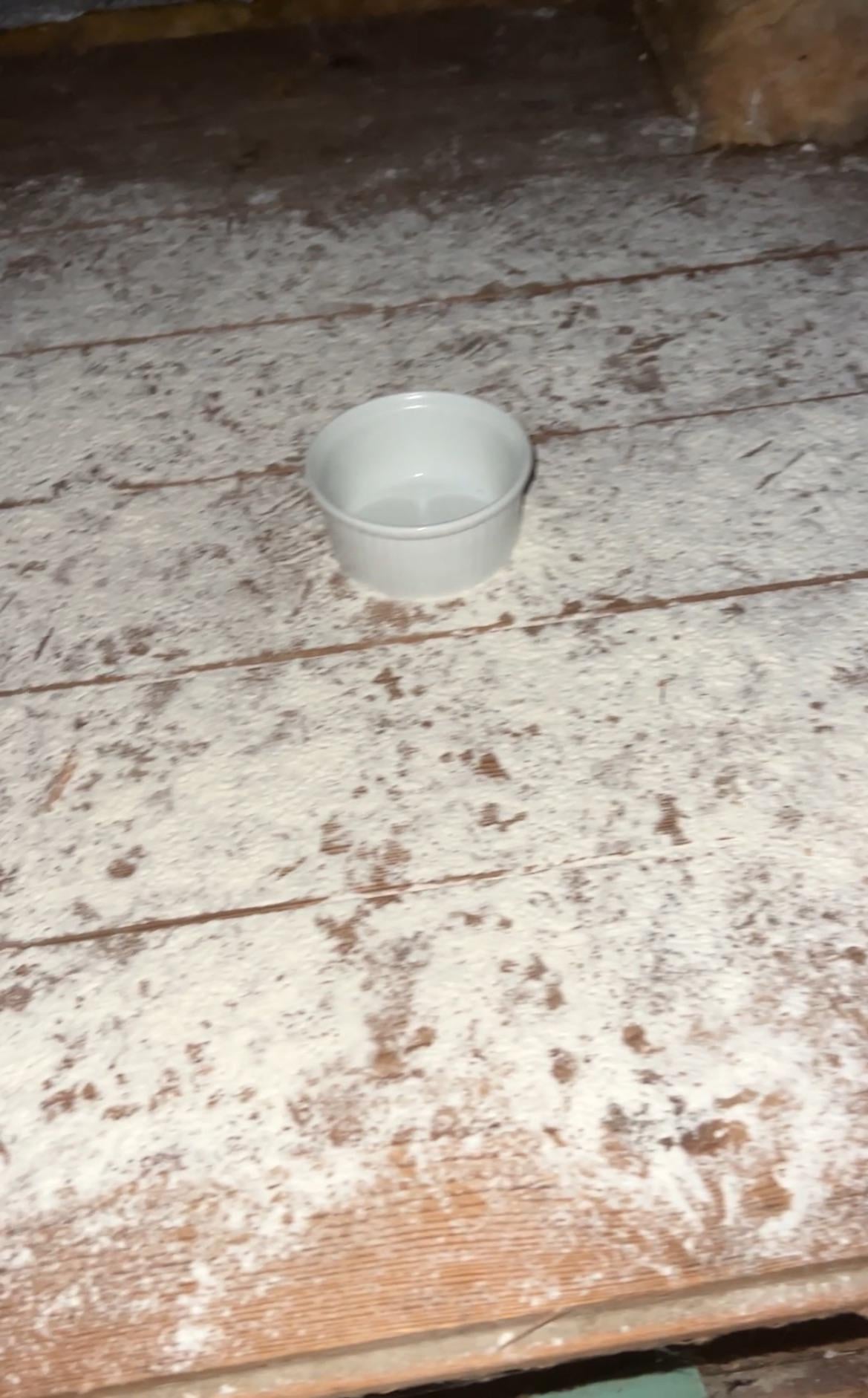 Opdatering: vi satte en ny skål med to pebernødder på loftet, og dryssede mel omkring. Over natten blev de spist, og i melet kan man se små fodspor og kradsemærker fra en gnaver. Nu er vi ikke længere i tvivl. Det er vores nabo.