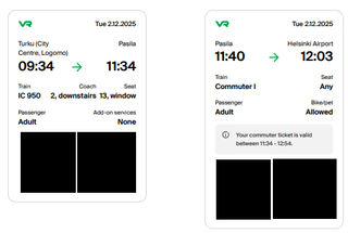 Hey everyone, I was scheduled to be in Finland for a week from November 24th to December 2nd, but sadly, I can't go anymore. I purchased VR train tickets from Helsinki Airport to Turku City Centre on the 24th and from Turku City Centre to Helsinki Airport on December 2nd. I'm happy to sell them if anyone is interested, so they won't go unused.