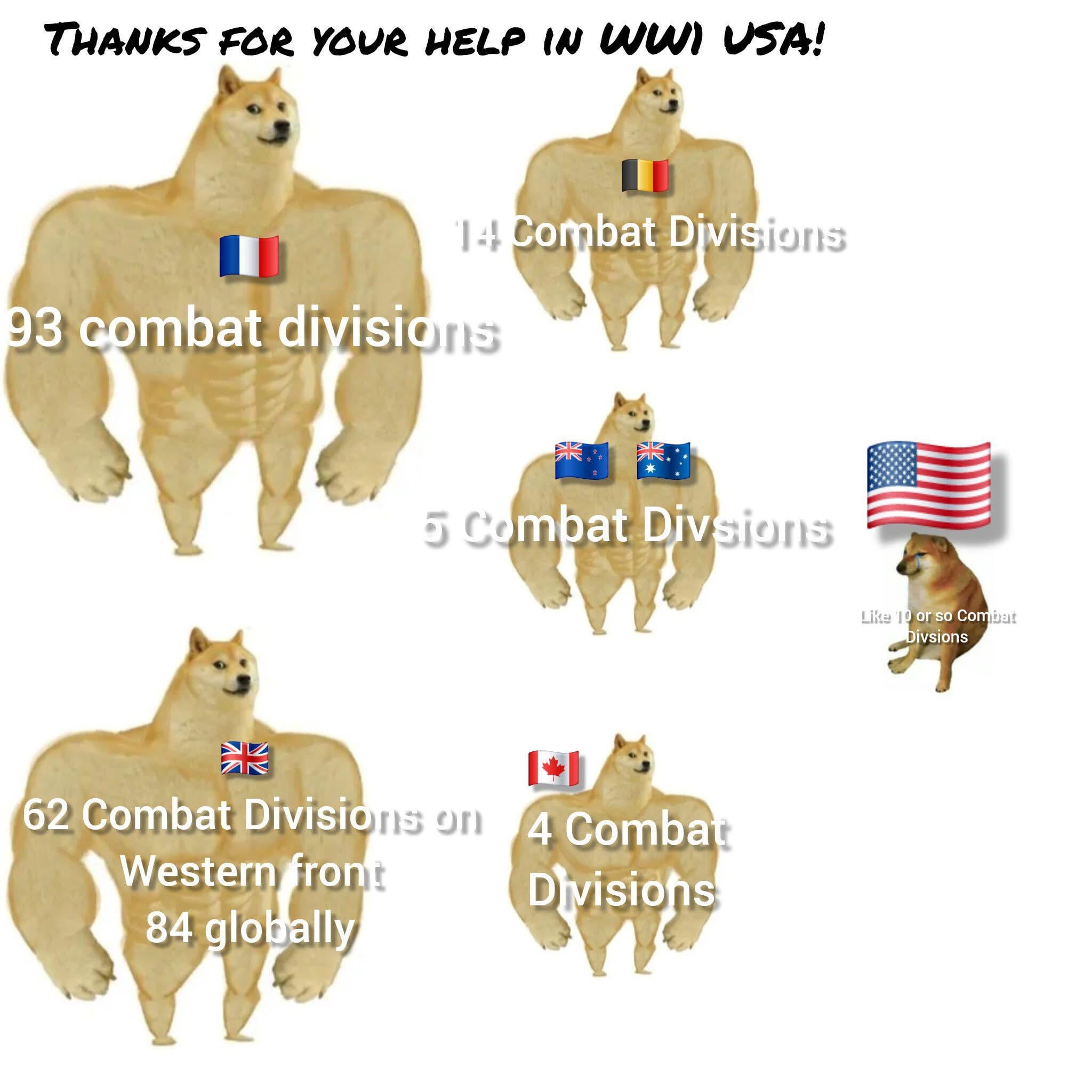 Lil bro is so obsessed with America. Americas combat divisions were twice the size of Europeans so it’s more like 25 combat divisions if we were to standardize it.