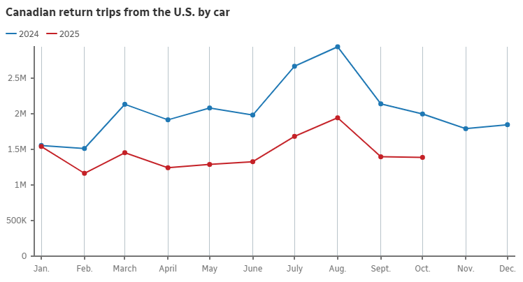 Overall, between February and October, the number of return trips by Canadians to the U.S. declined by 21 per cent for air travel and by a staggering 33.5 per cent for land travel, according to Statistics Canada data provided to CBC News.