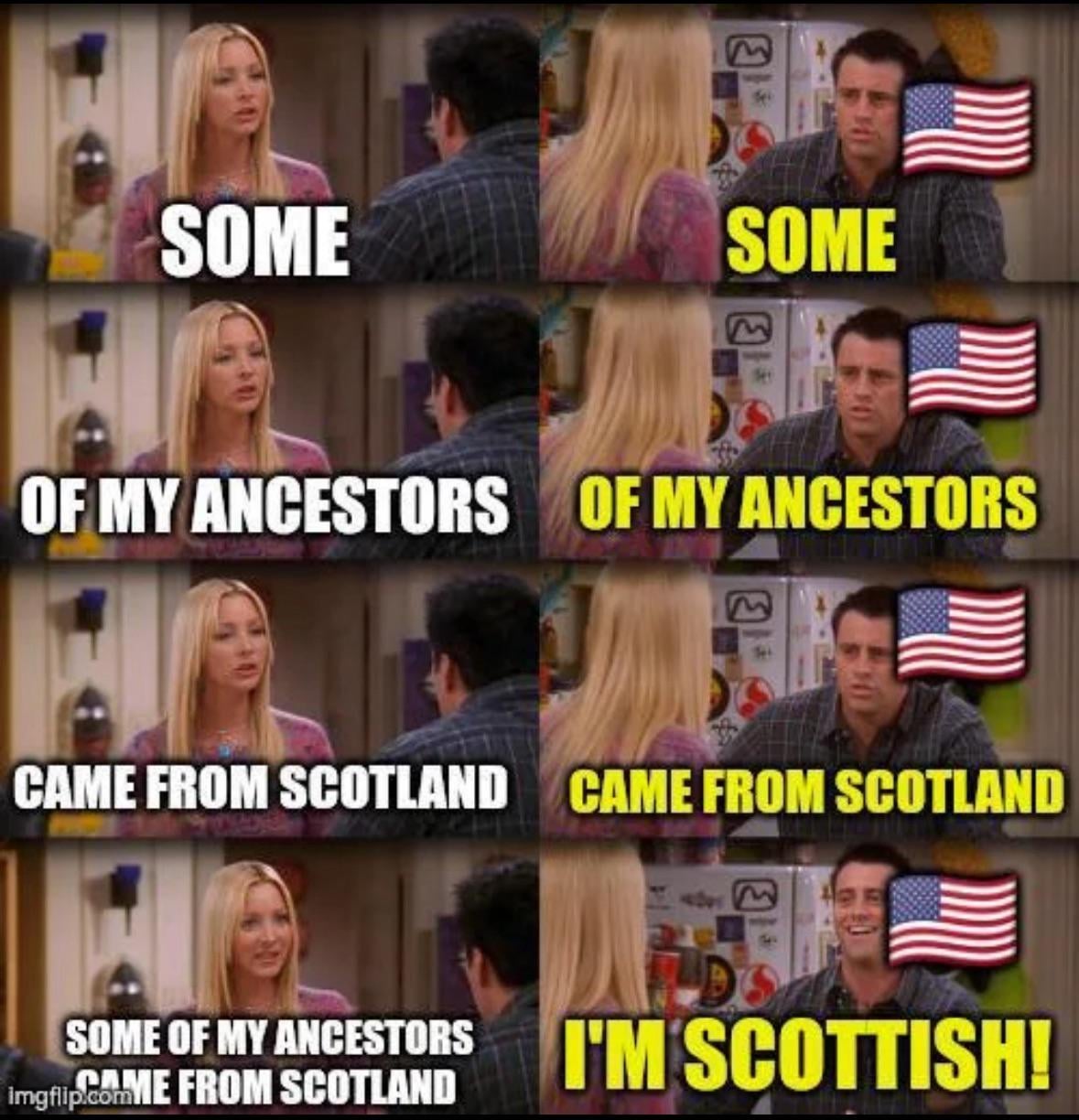 As a Scottish person I find this so frustrating, it’s gotten to the point where sometimes if I say in a post or comment that I’m Scottish, I’ll specify that I mean as I was born here and still live here, so people don’t think I’m some annoying American that thinks their Scottish because their great-great-great-great grandfather was possibly Scottish.