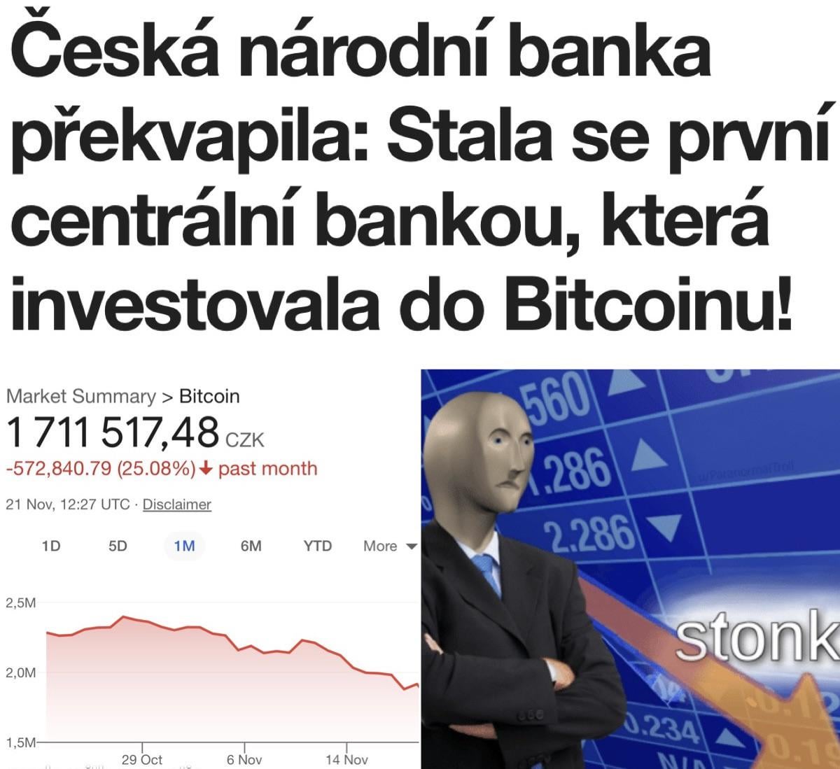 ČNB se stala první centrální bankou, která investovala do Bitcoinu. Bitcoin meanwhile: by Same-Poem9128 Tags:czech republic 22 comments Všichni u krypt ví, že bitcoin dolů o 30 % není nic. Už investovala, nebo prozatím vyčlenila budget na investici? Super, takže vlastně nevíš o čem děláš příspěvek milion USD není investice, je to jen na vyzkoušení si infrastruktury a procesů, jestli by zvládli držet větší množství btc jako rezervy. BTC se stane rezervní měnou, podobně jako zlato. Narozdíl od zlata lze totiž btc odeslat na jinou peněženku v případě, že by byl stát napaden. U zlata to nejde, resp. můžou ho poslat třeba do Švýcarska, ale z minulého století víme, že dostat ho pak zpět je těžké, skoro nemožné. Po konci 2. sv. války nám docela velkou část zlata nevrátili. Když si bitcoin koupím já taky taky jde pokaždý dolů. Takže se ČNB nedivím, že nakoupili v blbej čas Nahodou pecka. Z CNB se stal reverzni indikator jako ze Schiffa 😅 https://preview.redd.it/zojicesgjn2g1.png?width=1200&format=png&auto=webp&s=80a8270534671f2291a6ad9a801ed806a195d5db ČNB bought? Damp eet. Asi jako když ČNB prodávalo zlato, když byl low a nakupoval, když byl high. [https://www.reflex.cz/clanek/komentare/101610/vladimir-pikora-cesi-prisli-o-zlaty-poklad-aneb-jak-cnb-zlato-levne-prodala-aby-ho-draze-nakoupila.html](https://www.reflex.cz/clanek/komentare/101610/vladimir-pikora-cesi-prisli-o-zlaty-poklad-aneb-jak-cnb-zlato-levne-prodala-aby-ho-draze-nakoupila.html) https://preview.redd.it/qzyr7dc6kn2g1.jpeg?width=640&format=pjpg&auto=webp&s=cb1242481c8e775e2e0f6457aa7c132abcbe59be Jen 25.08% ? To mi ani nevraci ptsd na 2013 a 2017. Docela fklidu. Oni tak dlouho váhali, jestli to udělat, až ten bitcoin stihl vylézt z 16k na 120k a zase začít padat xd běžná volatilita btc, to je toho. Pořád lepší než to co udělali se zlatem.. Cesty lorda Bogdanoffa jsou nevyzpytatelné. Tenhle oříšek vyřeší jedině odborník. Není tu náhodou spolužák ze základky co by všechny pozval na kafe a poučil o finanční gramotnosti? Oni ale nekupovali před měsícem.. jen teda nejsem moc odborník, ale proč třeba i ČNB nenakupuje prokazatelně nejlepší metodou DCA ? https://preview.redd.it/1e3xt68qon2g1.jpeg?width=1240&format=pjpg&auto=webp&s=615fc58f3fb8bcc02d56f06b19770f09f36ab2b3 Já nakupuju. https://preview.redd.it/vqck5mbawn2g1.jpeg?width=300&format=pjpg&auto=webp&s=24bbc895a1c990b16ac118297e825cd69949382e Michl koupil? Domp iiit! [“Bitcoin is going to ZERO” – Warren Buffett WARNS!](https://www.youtube.com/watch?v=oOyp7rFDe2g) Comments are closed.