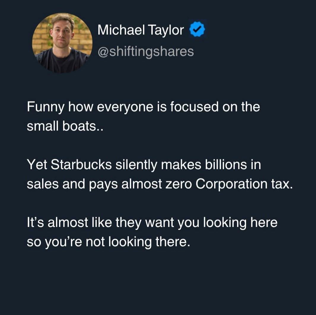 But yes, the massive deficit, the lack of investment into the NHS… it’s the small boats that are the problem. Definitely not billion dollar corporations avoiding to pay 10s if not 100’s of million in taxes each year.