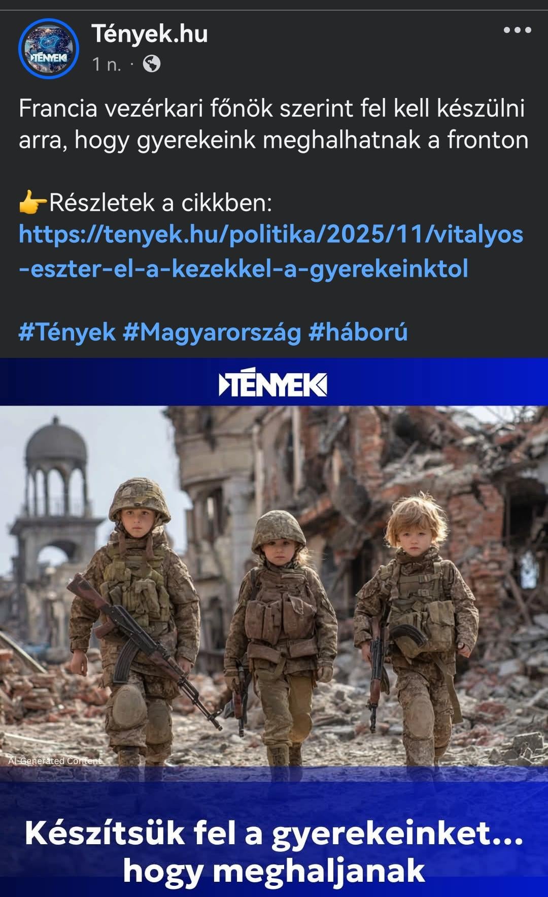 Pedig ez most tényleg igaz! A francia vezérkari főnök tényleg azt mondta, hogy fel kell készülni (ha engedünk az oroszoknak és hagyjuk Putyinnak, hogy elpusztítsa Ukrajnát és folytassa az expanziót nyugat felé) arra, hogy a gyermekeink meghalnak a fronton (a francia katonai szlengben a “gyermekeink” alatt a fiatal katonákat értik).