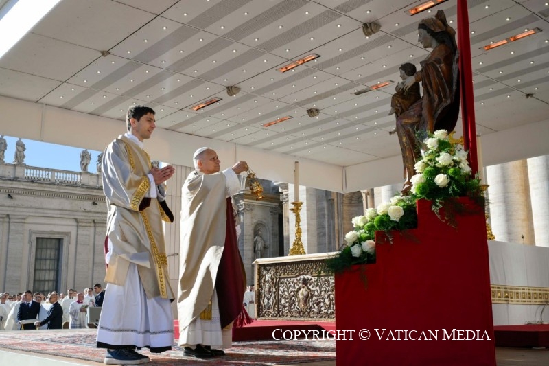 In the responsorial Psalm, we have sung, “Let us go rejoicing to the house of the Lord” (cf. Ps 122). Today’s liturgy invites us, therefore, to walk together in praise and joy towards the encounter with the Lord Jesus Christ, King of the Universe, gentle and humble Sovereign, the One who is the beginning and end of all things. His power is love, his throne the Cross, and through the Cross his Kingdom shines forth upon the world. “From the wood he reigns” (cf. Hymn Vexilla Regis) as Prince of Peace and King of Justice who, in his Passion, reveals to the world the immense mercy of God’s heart. This love is also the inspiration and motive for your singing.