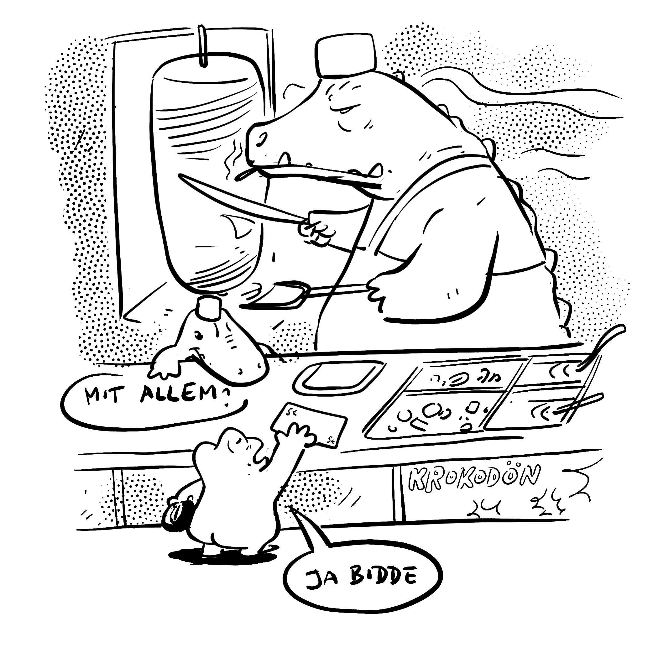 Gibt es da auch Krokoketten? Dönerbox mit Krokoketten und Dönerfleisch drauf für den Verzehr unterwegs. Oder Dönertasche mit Krokoketten und Dönerfleisch?