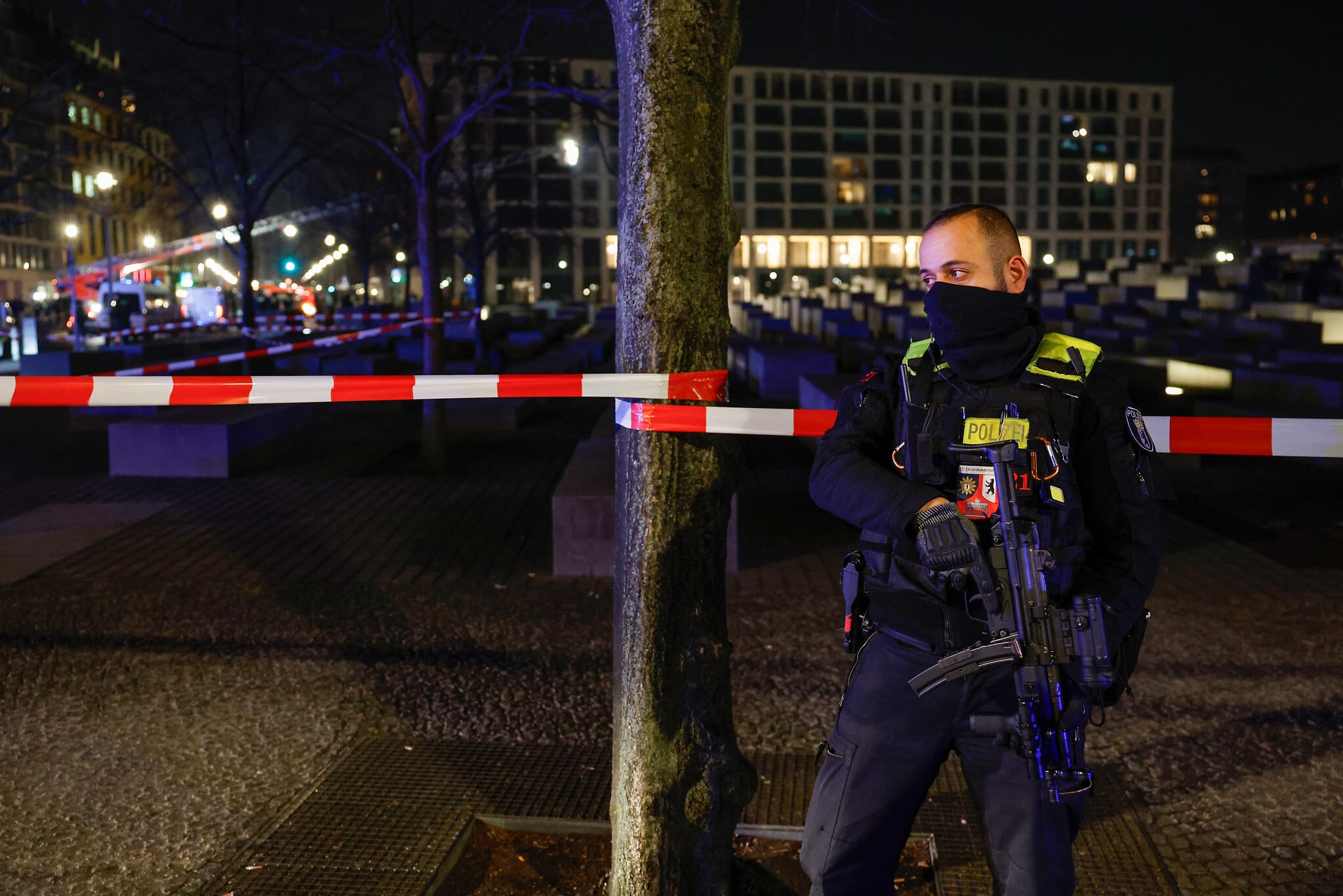 An armed police officer works at the cordoned off scene where a person was stabbed near the memorial of the murdered Jews of Europe in Berlin on February 21, 2025. (Odd ANDERSEN / AFP)