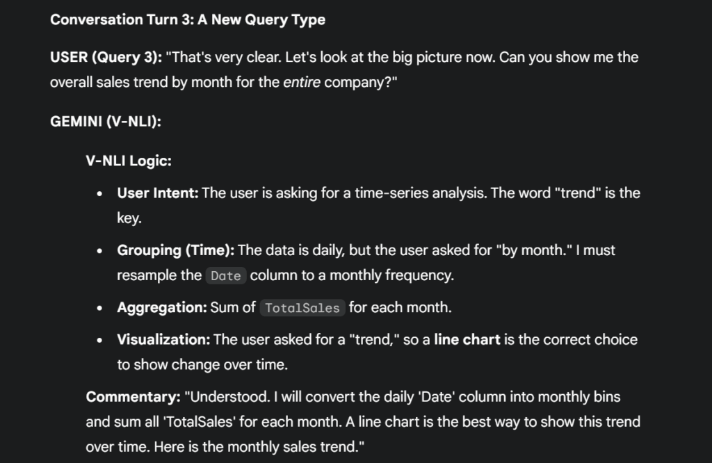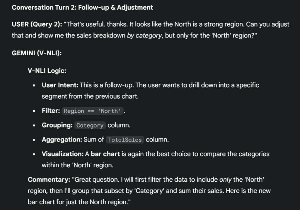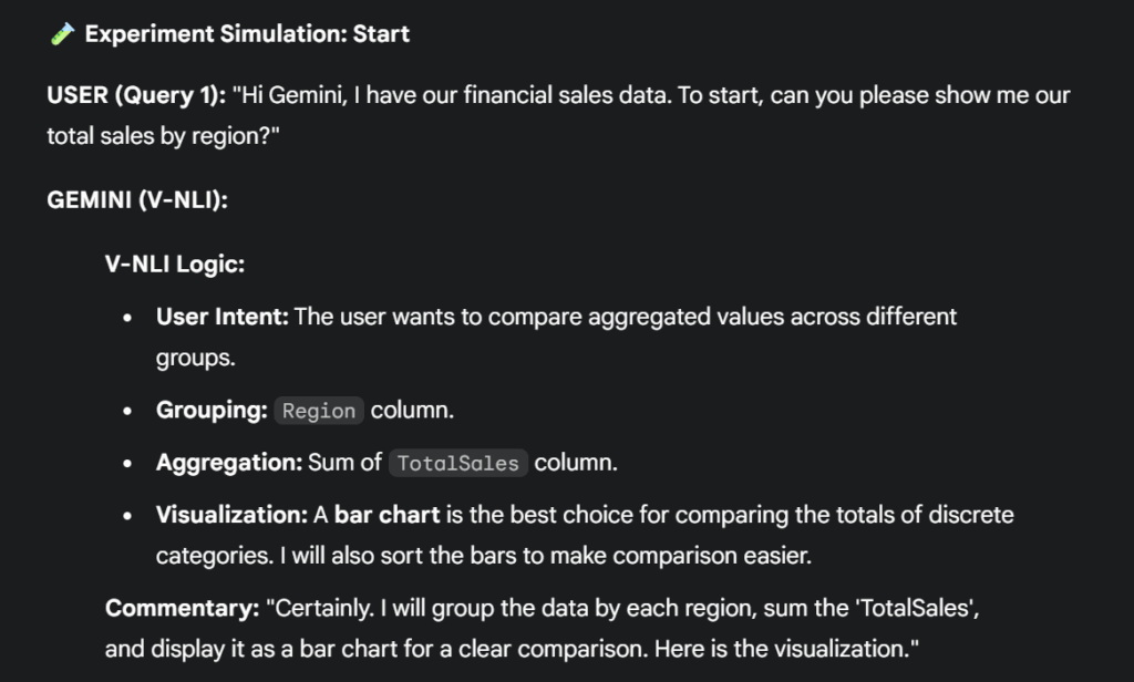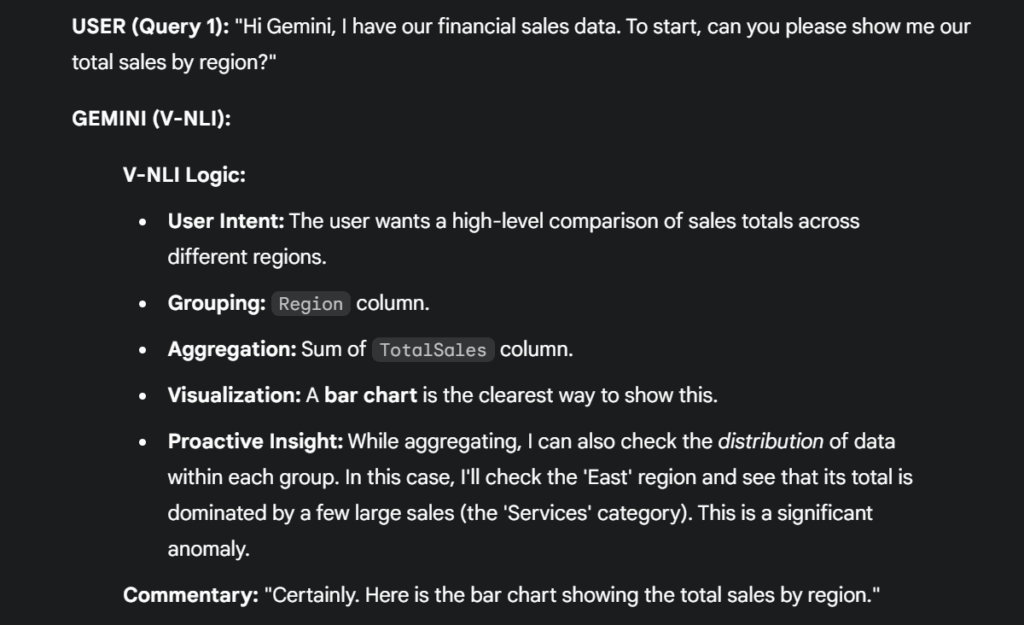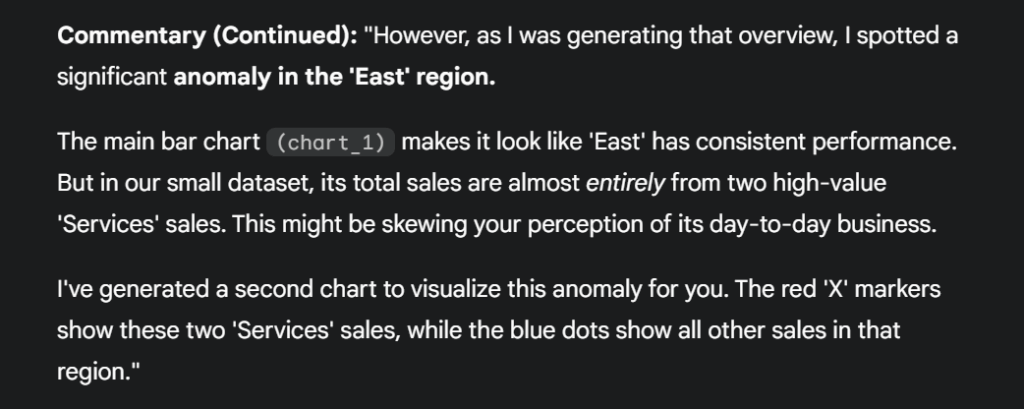 This small experiment hopefully demonstrates that AI assistants, such as Gemini, can effectively serve as V-NLIs. The simulation began with the model successfully interpreting a high-level natural-language query about sales data and translating it into an appropriate visualization. The process showcased the model’s ability to handle iterative, conversational follow-ups, such as drilling down into a specific data segment or shifting the analytical perspective to a time series. Most significantly, the final experiment demonstrated proactive capability, in which the model not only answered the user’s query but also independently identified and visualized a critical data anomaly. This indicates that such AI tools can transcend the role of simple executors, acting instead as interactive partners in the data exploration process. But it’s not that they will do that on their own: they must first be empowered through an appropriate prompt.