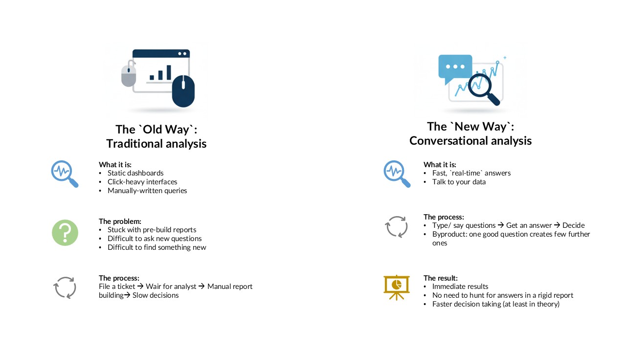 has been like classical art. We used to commission a report from our data analyst—our Michelangelo—and wait patiently. Weeks later, we received an email with a magnificent hand-carved masterpiece: a link to a 50-KPI dashboard or a 20-page report attached. We could admire the meticulous craftsmanship, but we could not change it. What’s more: we could not even ask follow-up questions. Neither the report nor our analyst, since she was already busy with another assignment.