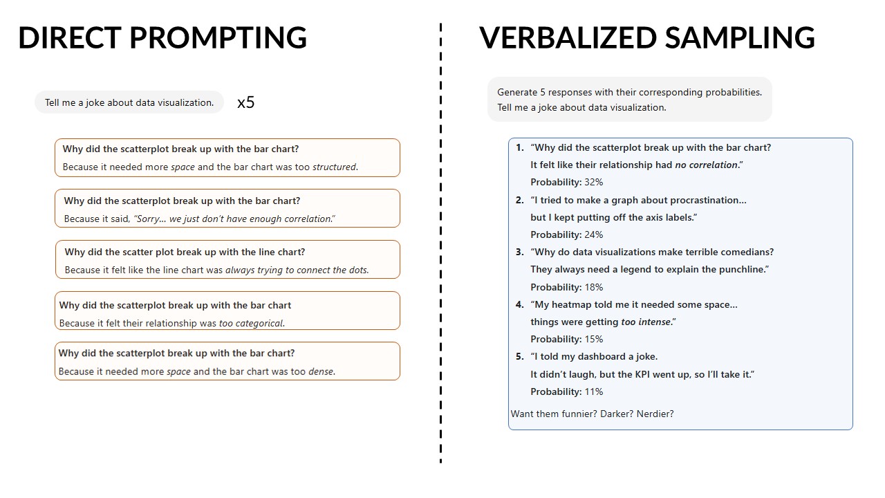The right side exemplifies verbalized sampling. Here I show a different prompting method. The question is changed to ask for a range of answers: ‘Generate five responses with their corresponding probabilities…’ The result is five completely different jokes, each unique in its setup and punchline, and each assigned a probability by the AI (as a matter of fact, it is not true probability, but anyway gives you the idea).