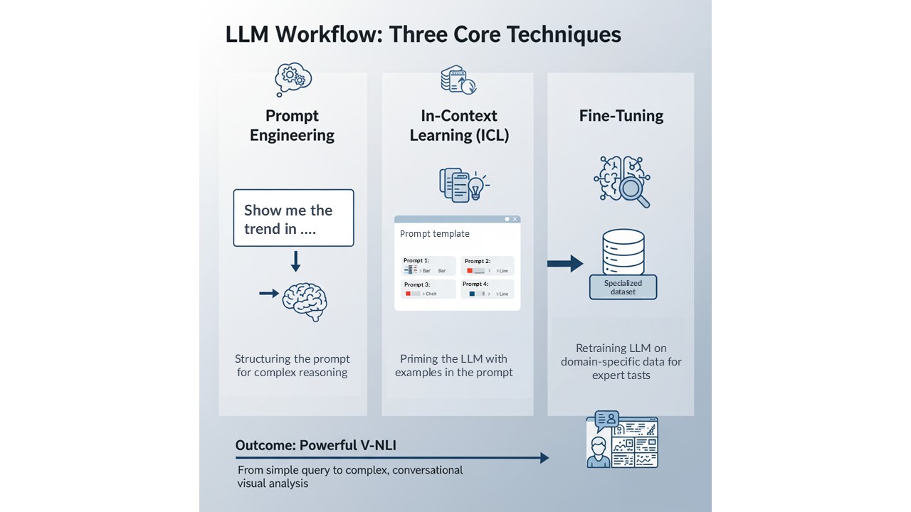 Three key techniques power this new, LLM-centric workflow. The first is Prompt Engineering, a new discipline focused on carefully structuring the text prompt—sometimes using advanced strategies like ‘Tree-of-Thoughts’—to help the LLM reason through a complex data query instead of just making a quick guess. A related method is In-Context Learning (ICL), which primes the LLM by placing a few examples of the desired task (like sample text-to-chart pairs) directly into the prompt itself. Finally, for highly specialized fields, Fine-Tuning is used. This involves re-training the base LLM on a large, domain-specific dataset. These pillars, when in place, enable the creation of a powerful V-NLI that can handle complex tasks and specialized charts that would be impossible for any generic model.